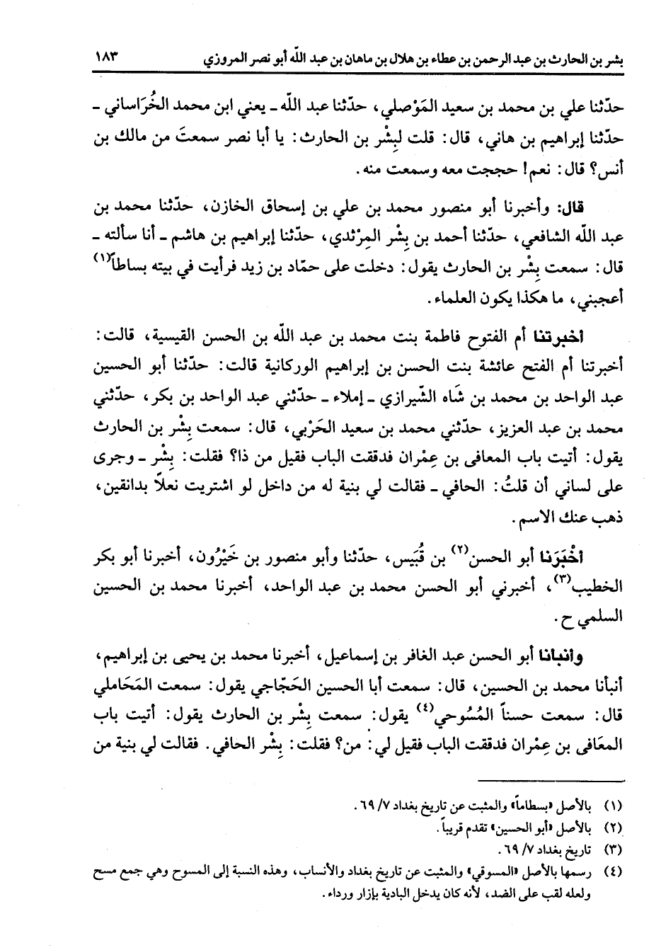 حدثنا علي بن محمد بن سعيد الموصلي حدثنا عبد الله يعني ابن محمد الخراساني حدثنا إبراهيم بن هاني قال قلت لبشر بن الحارث يا أبا نصر سمعت من مالك بن أنس قال نعم حججت معه وسمعت منه قال وأخبرنا أبو منصور محمد بن علي بن إسحاق الخازن حدثنا محمد بن عبد الله الشافعي حدثنا أحمد بن بشر المرثدي حدثنا إبراهيم بن هاشم أنا سألته قال سمعت بشر بن الحارث يقول دخلت على حماد بن زيد فرأيت في بيته بساطا (1) أعجبني ما هكذا يكون العلماء أخبرتنا أم الفتوح فاطمة بنت محمد بن عبد الله بن الحسن القيسية قالت أخبرتنا أم الفتح عائشة بنت الحسن بن إبراهيم الوركانية قالت حدثنا أبو الحسين عبد الواحد بن محمد بن شاه الشيرازي إملاحدثني عبد الواحد بن بكر حدثني محمد بن عبد العزيز حدثني محمد بن سعيد الحربي قال سمعت بشر بن الحارث يقول أتيت باب المعافى بن عمران فدققت الباب فقيل من ذا فقلت بشر وجرى على لساني أن قلت الحافي فقالت لي بنية له من داخل لو اشتريت نعلا بدانقين ذهب عنك الاسم أخبرنا أبو الحسن (2) بن قبيس حدثنا وأبو منصور بن خيرون أخبرنا أبو بكر الخطيب (3) أخبرني أبو الحسن محمد بن عبد الواحد أخبرنا محمد بن الحسين السلمي وأنبأنا أبو الحسن عبد الغافر بن إسماعيل أخبرنا محمد بن يحيى بن إبراهيم أنبأنا محمد بن الحسين قال سمعت أبا الحسين الحجاجي يقول سمعت المحاملي قال سمعت حسنا المسوحي (4) يقول سمعت بشر بن الحارث يقول أتيت باب المعافى بن عمران فدققت الباب فقيل لي من فقلت بشر الحافي فقالت لي بنية من