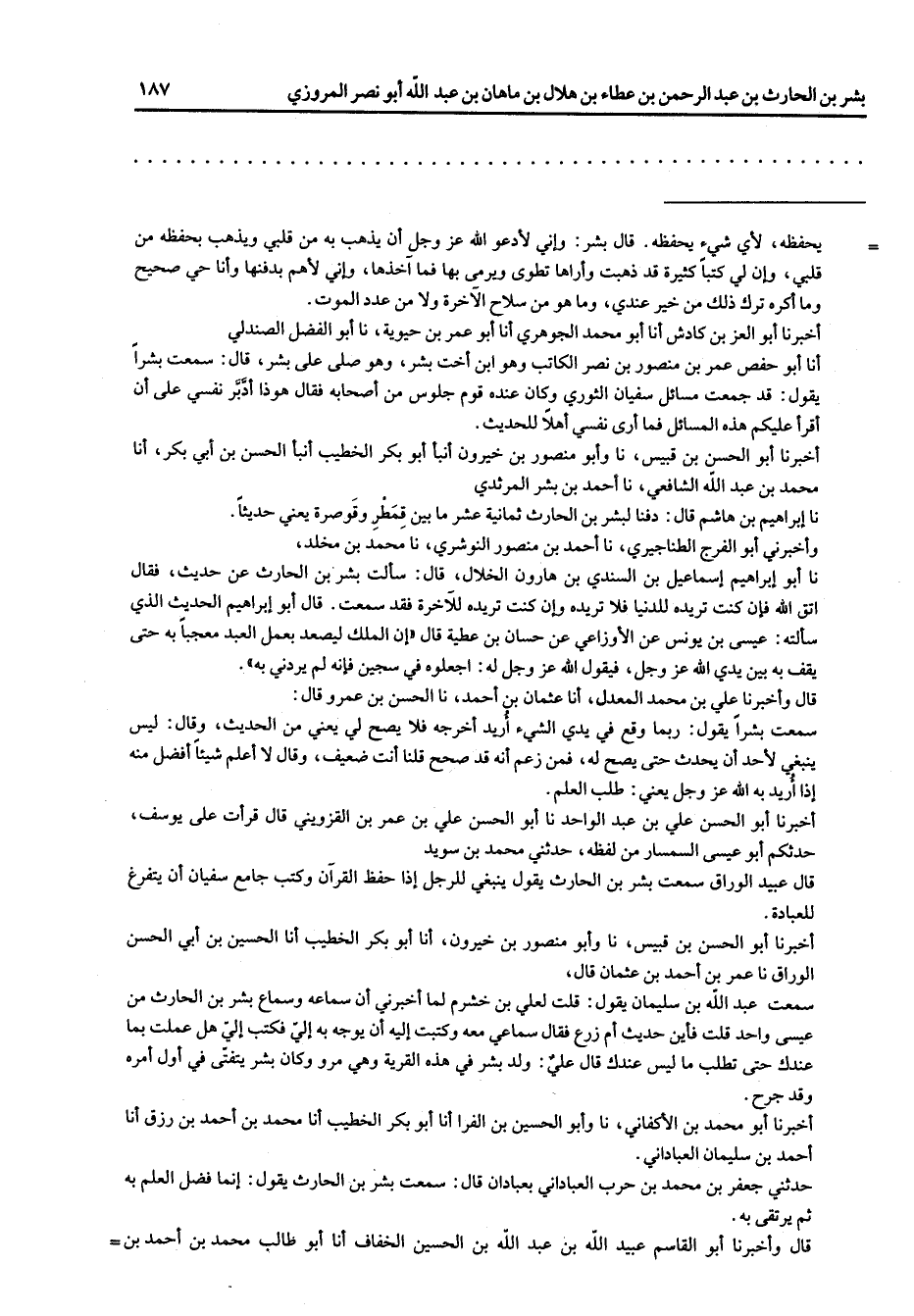 أخبرنا أبو الحسن بن قبيس نا وأبو منصور بن خيرون أنا أبو بكر الخطيب أنا الحسين بن أبي الحسن الوراق نا عمر بن أحمد بن عثمان قال سمعت عبد الله بن سليمان يقول: قلت لعلي بن خشرم لما أخبرني أن سماعه وسماع بشر بن الحارث من عيسى واحد قلت فأين حديث أم زرع فقال سماعي معه وكتبت إليه أن يوجه به إلى فكتب إلي هل علمت بما عندك حتى تطلب ما ليس عندك قال علي: ولد بشر في هذه القرية وهي مرو وكان بشر يتفتى في أول أمره وقد جرح