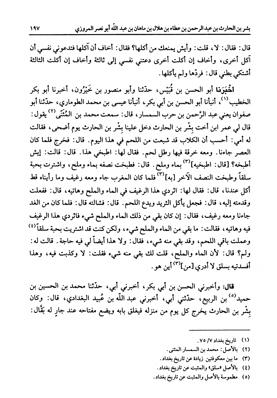 قال لي عمر ابن أخت بشر بن الحارث دخل علينا بشر بن الحارث يوم أضحى فقالت له أمي أحسب أن الكلاب قد شبعت من اللحم في هذا اليوم قال فخرج فلما كان العصر جاءنا ومعه خرقة فيها رطل لحم فقال لها اطبخي هذا قال قالت إيش أطبخه قال اطبخيه قال: اطبخية (3) بماء وملح قال فطبخت نصفه بماء وملح واشترت بحبة سلقا وطبخت النصف الآخر به (3) فلما كان المغرب جاء ومعه رغيف وما رأيناه قط آكل عندنا قال فقال لها اثردي هذا الرغيف في الماء والملح وهاتيه قال ففعلت وقدمته إليه قال فجعل يأكل الثريد ويدع اللحم قال فشالته قال فلما كان من الغد جاءنا ومعه رغيف فقال إن كان بقي من الماء والملح شئ فاثردي هذا الرغيف فيه وهاتيه فقالت ما بقي من الماء والملح شئ ولكن كنت قد اشتريت بحبة سلقا (4) وعملت باقي اللحم وقد بقي منه شئ فقال ولا هذا أيضا لي فيه حاجة قالت له ولم قال لأن الماء والملح قلت لك بقي منه شئ فقلت لا وكذبت فيه وهذا أفسدتيه بسلق لا أدري من (3) أين هو قال وأخبرني الحسن بن أبي بكر أخبرني أبي حدثنا محمد بن الحسين بن حميد (5) بن الربيع حدثني أبي أخبرني عبد الله بن عبيد البغدادي قال وكان بشر بن الحارث يخرج كل يوم من منزله فيغلق بابه ويضع مفتاحه عند جار له بقال