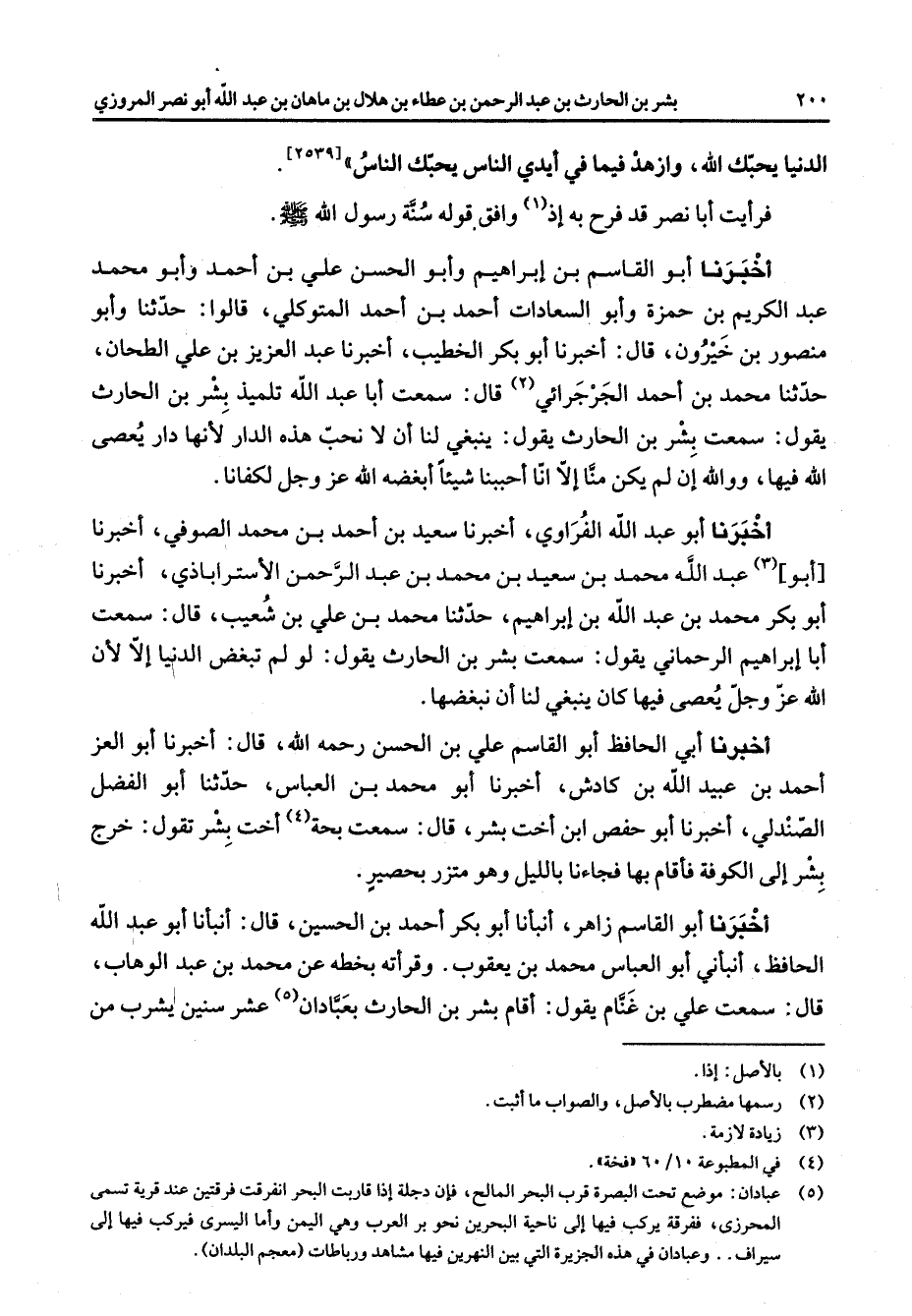 الدنيا يحبك الله وازهد فيما في أيدي الناس يحبك الناس فرأيت أبا نصر قد فرح به إذ (1) وافق قوله سنة رسول الله (صلى الله عليه وسلم) أخبرنا أبو القاسم بن إبراهيم وأبو الحسن علي بن أحمد وأبو محمد عبد الكريم بن حمزة وأبو السعادات أحمد بن أحمد المتوكلي قالوا حدثنا وأبو منصور بن خيرون قال أخبرنا أبو بكر الخطيب أخبرنا عبد العزيز بن علي الطحان حدثنا محمد بن أحمد الجرجراني (2) قال سمعت أبا عبد الله تلميذ بشر بن الحارث يقول سمعت بشر بن الحارث يقول ينبغي لنا أن لا نحب هذه الدار لأنها دار يعصى الله فيها ووالله إن لم يكن منا إلا أنا أحببنا شيئا أبغضه الله عز وجل لكفانا أخبرنا أبو عبد الله الفراوي أخبرنا سعيد بن أحمد بن محمد الصوفي أخبرنا أبو (3) عبد الله محمد بن سعيد بن محمد بن عبد الرحمن الأستراباذي أخبرنا أبو بكر محمد بن عبد الله بن إبراهيم حدثنا محمد بن علي بن شعيب قال سمعت أبا إبراهيم الرحماني يقول سمعت بشر بن الحارث يقول لو لم تبغض الدنيا إلا لأن الله عز وجل يعصى فيها كان ينبغي لنا أن نبغضها أخبرنا أبي الحافظ أبو القاسم علي بن الحسن رحمه الله قال أخبرنا أبو العز أحمد بن عبيد الله بن كادش أخبرنا أبو محمد بن العباس حدثنا أبو الفضل الصندلي أخبرنا أبو حفص ابن أخت بشر قال سمعت بحة (4) أخت بشر تقول خرج بشر إلى الكوفة فأقام بها فجاءنا بالليل وهو متزر بحصير أخبرنا أبو القاسم زاهر أنبأنا أبو بكر أحمد بن الحسين قال أنبأنا أبو عبد الله الحافظ أنبأني أبو العباس محمد بن يعقوب وقرأته بخطه عن محمد بن عبد الوهاب قال سمعت علي بن غنام يقول أقام بشر بن الحارث بعبادان (5) عشر سنين يشرب من