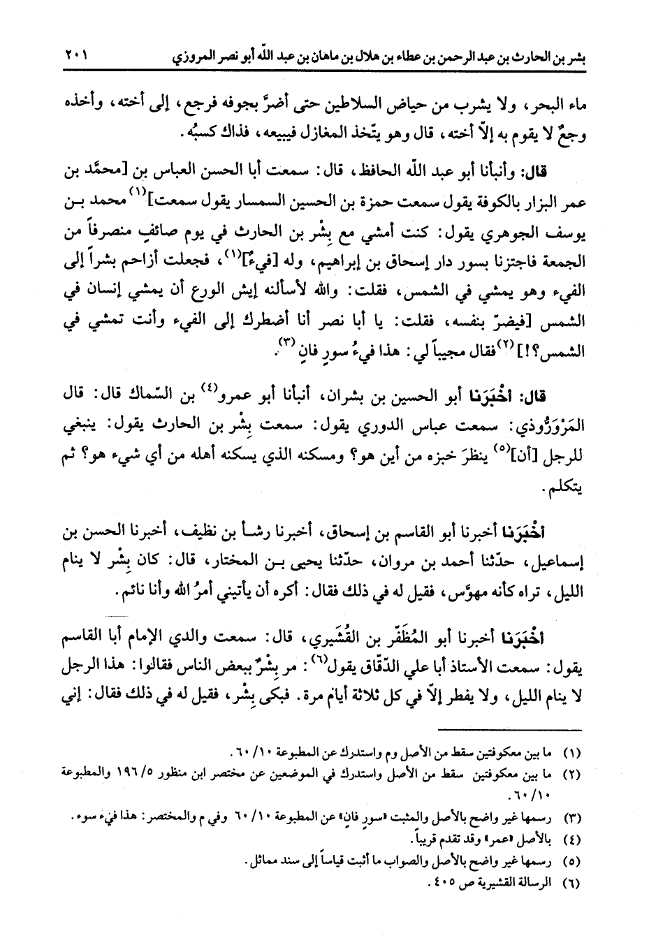 ماء البحر ولا يشرب من حياض السلاطين حتى أضر بجوفه فرجع إلى أخته وأخذه وجع لا يقوم به إلا أخته قال وهو يتخذ المغازل فيبيعه فذاك كسبه قال وأنبأنا أبو عبد الله الحافظ قال سمعت أبا الحسن العباس بن محمد بن عمر البزاز بالكوفة يقول سمعت حمزة بن الحسين السمسار يقول سمعت (1) محمد بن يوسف الجوهري يقول كنت أمشي مع بشر بن الحارث في يوم صائف منصرفا من الجمعة فاجتزنا بسور دار إسحاق بن إبراهيم وله فئ (1) فجعلت أزاحم بشرا إلى الفئ وهو يمشي في الشمس فقلت والله لأسألنه إيش الورع أن يمشي إنسان في الشمس فيضر بنفسه فقلت يا أبا نصر أنا أضطرك إلى الفئ وأنت تمشي في الشمس (2) فقال مجيبا لي هذا فئ سور فان (3) قال أخبرنا أبو الحسين بن بشران أنبأنا أبو عمرو (4) بن السماك قال قال المروروذي سمعت عباس الدوري يقول سمعت بشر بن الحارث يقول ينبغي للرجل أن (5) ينظر خبزه من أين هو ومسكنه الذي يسكنه أهله من أي شئ هو ثم يتكلم أخبرنا أخبرنا أبو القاسم بن إسحاق أخبرنا رشأ بن نظيف أخبرنا الحسن بن إسماعيل حدثنا أحمد بن مروان حدثنا يحيى بن المختار قال كان بشر لا ينام الليل تراه كأنه مهوس فقيل له في ذلك فقال أكره أن يأتيني أمر الله وأنا نائم أخبرنا أخبرنا أبو المظفر بن القشيري قا سمعت والدي الإمام أبا القاسم يقول سمعت الأستاذ أبا علي الدقاق يقول (6) مر بشر ببعض الناس فقالوا هذا الرجل لا ينام الليل ولا يفطر إلا في كل ثلاثة أيام مرة فيكى بشر فقيل له في ذلك فقال إني