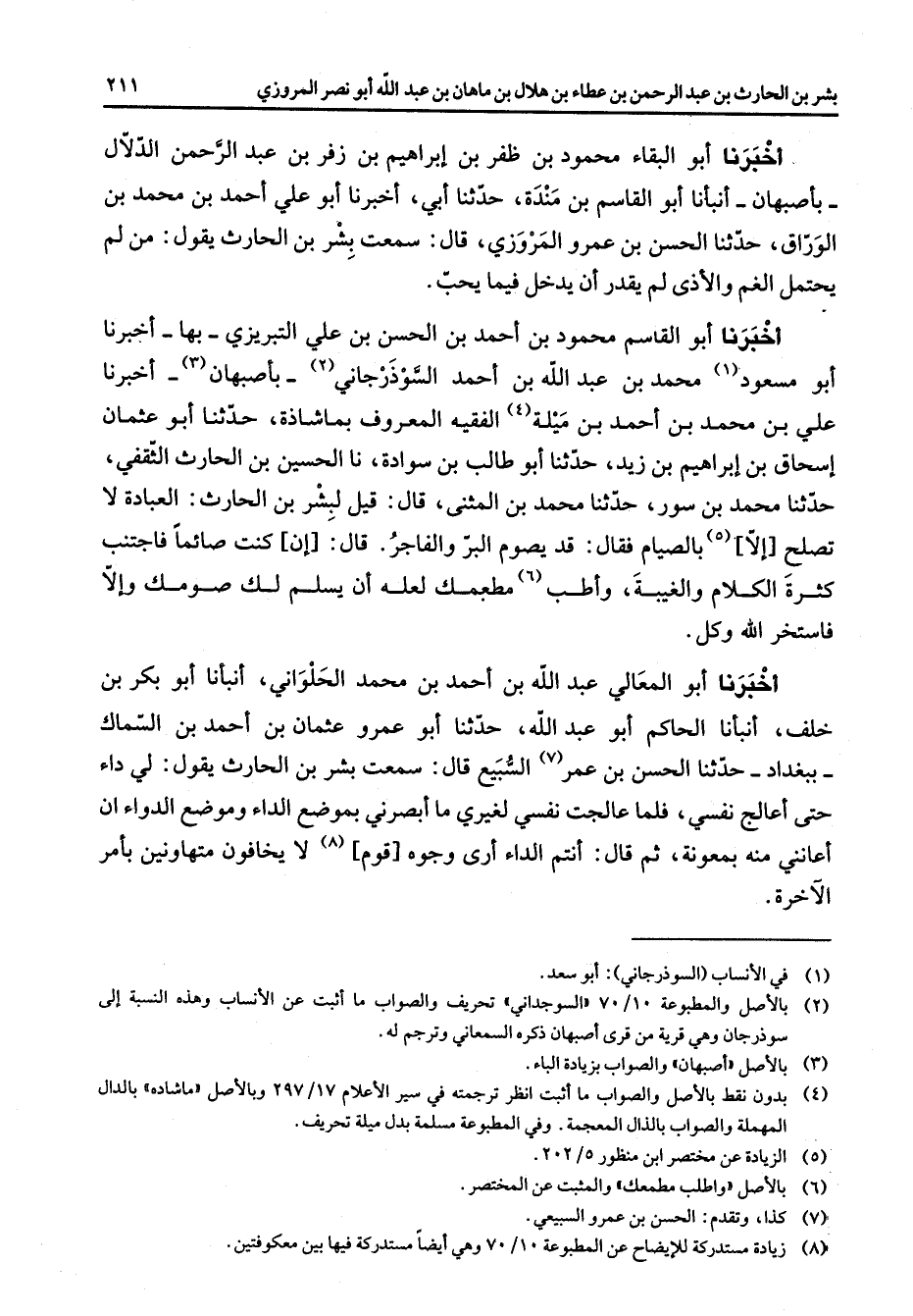 أخبرنا أبو البقاء محمود بن ظفر بن إبراهيم بن زفر بن عبد الرحمن الدلال بأصبهان أنبأنا أبو القاسم بن مندة حدثنا أبي أخبرنا أبو علي أحمد بن محمد بن الوراق حدثنا الحسن بن عمرو المروزي قال سمعت بشر بن الحارث يقول من لم يحتمل الغم والأذى لم يقدر أن يدخل فيما يحب أخبرنا أبو القاسم محمود بن أحمد بن الحسن بن علي التبريزي بها أخبرنا أبو مسعود (1) محمد بن عبد الله بن أحمد السوذرجاني (2) بأصبهان (3) أخبرنا علي بن محمد بن أحمد بن ميلة (4) الفقيه المعروف بما شاذة حدثنا أبو عثمان إسحاق بن إبراهيم بن زيد حدثنا أبو طالب بن سوادة نا الحسين بن الحارث الثقفي حدثنا محمد بن سور حدثنا محمد بن المثنى قال قيل لبشر بن الحارث العبادة لا تصلح إلا (5) بالصيام فقال قد يصوم البر والفاجر قال إن كنت صائما فاجتنب كثرة الكلام والغيبة وأطب (6) مطعمك لعله أن يسلم لك صومك وإلا فاستخر الله وكل أخبرنا أبو المعالي عبد الله بن أحمد بن محمد الحلواني أنبأنا أبو بكر بن خلف أنبأنا الحاكم أبو عبد الله حدثنا أبو عمرو عثمان بن أحمد بن السماك ببغداد حدثنا الحسن بن عمر (7) السبيع قال سمعت بشر بن الحارث يقول لي داء حتى أعالج نفسي فلما عالجت بنفسي لغيري ما أبصرني بموضع الداء وموضع الدواء أعانني منه بمعونة ثم قال أنتم الداء أرى وجوه قوم (8) لا يخافون متهاونين بأمر الآخرة