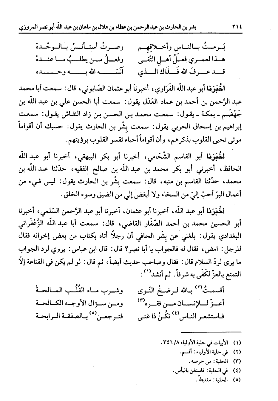 برمت بالناس وأخلاقهم * وصرت أستأنس بالوحدة هذا لعمري فعل أهل التقى * وفعل من يطلب ما عنده * * قد عرف الله فذاك الذي * آنسه الله به وحده * أخبرنا أبو عبد الله الفراوي أخبرنا أبو عثمان الصابوني قال سمعت أبا محمد عبد الرحمن بن أحمد بن عماد العدل يقول سمعت أبا الحسن علي بن عبد الله بن جهضم بمكة يقول سمعت محمد بن الحسن بن زاد النقاش يقول سمعت إبراهيم بن إسحاق الحربي يقول سمعت بشر بن الحارث يقول حسبك أن أقواما موتى تحيى القلوب بذكرهم وأن أقواما أحياء تقسو القلوب برؤيتهم أخبرنا أبو القاسم الشحامي أخبرنا أبو بكر البيهقي أخبرنا أبو عبد الله الحافظ أخبرني أبو بكر محمد بن عبد الله بن صالح الفقيه حدثنا عبد الله بن محمد حدثنا القاسم بن منبه قال سمعت بشر بن الحارث يقول ليس شئ من أعمال البر أحب إلي من السخاء ولا أبغض إلي من الضيق وسوء الخلق أخبرنا أبو عبد الله أخبرنا أبو عثمان أخبرنا أبو عبد الرحمن السلمي أخبرنا أبو الحسين محمد بن أحمد الصفار القاضي قال سمعت أبا عبد الله الزعفراني البغدادي يقول بلغني عن بشر الحافي أن رجلا أتاه بكتاب من بعض إخوانه فقال للرجل امض فقال له فالجواب يا أبا نصر قال قال ابن عباس يروي لرد الجواب ما يرى لرد السلام قال فقال وصاحب حديث أيضا ثم قال لو لم يكن في القناعة إلا التمتع بالعز لكفى به شرفا ثم أنشد (1) * أقسمت (2) بالله لرضخ النوى * وشرب ماء القلب المالحة أعز للإنسان من فقره (3) * ومن سؤال الأوجه الكالحة فأستشعر الناس (4) تكن ذا غنى * فترجعن (5) بالصفقة الرابحة