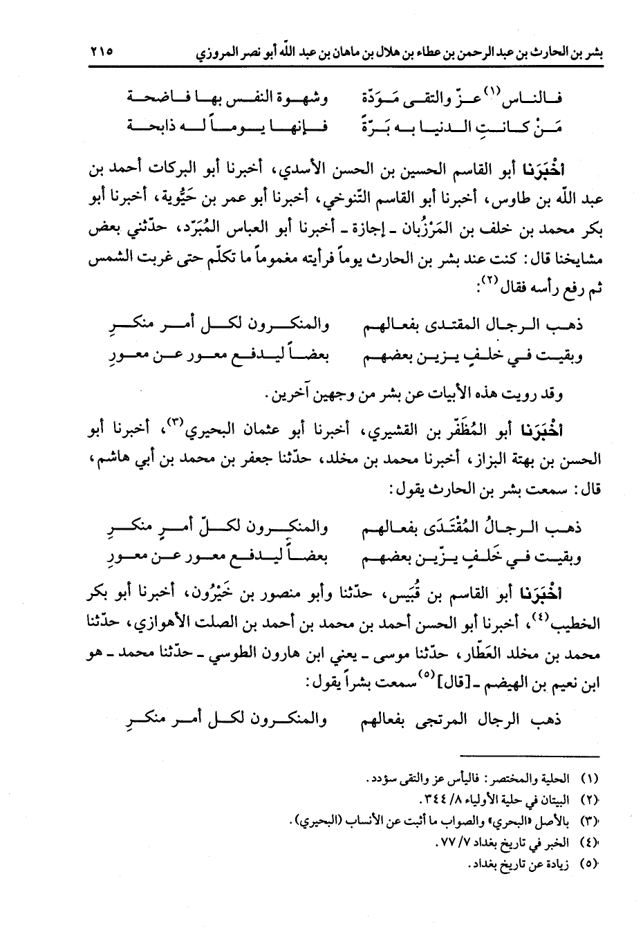 فالناس (1) عز والتقى مودة * وشهوة النفس بها فاضحة من كانت الدنيا به برة * فإنها يوما له ذابحة * أخبرنا أبو القاسم الحسين بن الحسن الأسدي أخبرنا أبو البركات أحمد بن عبد الله بن طاوس أخبرنا أبو القاسم التنوخي أخبرنا أبو عمر بن حيوية أخبرنا أبو بكر محمد بن خلف بن المرزبان إجازة أخبرنا أبو العباس المبرد حدثني بعض مشايخنا قال كنت عند بشر بن الحارث يوما فرأيته مغموما ما تكلم حتى غربت الشمس ثم رفع رأسه فقال (2) ذهب الرجال المقتدى بفعالهم * والمنكرون لكل أمر منكر وبقيت في خلف يزين بعضهم * بعضا ليدفع معور عن معور * وقد رويت هذه الأبيات عن بشر من وجهين آخرين أخبرنا أبو المظفر بن القشيري أخبرنا أبو عثمان البحيري (3) أخبرنا أبو الحسن بن بهتة البزاز أخبرنا محمد بن مخلد حدثنا جعفر بن محمد بن أبي هاشم قال سمعت بشر بن الحارث يقول * ذهب الرجال المقتدى بفعالهم * والمنكوب لكل أمر منكر وبقيت في خلف يزين بعضهم * بعضا يلدفع معور عن معور * أخبرنا أبو القاسم بن قبيس حدثنا وأبو منصور بن خيرون أخبرنا أبو بكر الخطيب (4) أخبرنا أبو الحسن أحمد بن محمد بن أحمد بن الصلت الأهوازي حدثنا محمد بن مخلد العطار حدثنا موسى يعني ابن هارون الطوسي حدثنا محمد هو ابن نعيم بن الهيضم قال (5) سمعت بشرا يقول * ذهب الرجال المرتجى بفعالهم * والمنكرون لكل أمر منكر