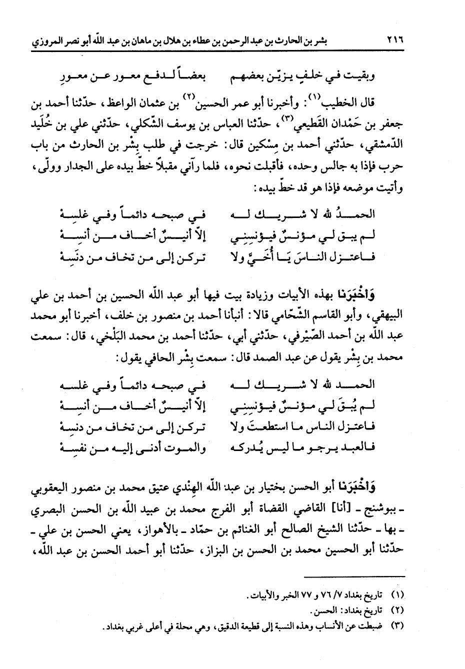 حرب فإذا به جالس وحده فأقبلت نحوه فلما رآني مقبلا خطبيده على الجدار وولى وأتيت موضعه فإذا هو قد خط بيده * الحمد لله لا شريك له في صبحه دائما وفي غلسة لم يبق لي مؤنس فيؤنسني * إلا أنين أخاف من أنسه فاعتزل الناس يا أخي ولا * تركن إلى من تخاف من دنسه * وأخبرنا بهذه الأبيات وزيادة بيت فيها أبو عبد الله الحسين بن أحمد بن علي البيهقي وأبو القاسم الشحامي قالا أنبأنا أحمد بن منصور بن خلف أخبرنا أبو محمد عبد الله بن أحمد الصيرفي حدثني أبي حدثنا أحمد بن محمد البلخي قال سمعت محمد بن بشر يقول عن عبد الصمد قال سمعت بشر الحافي يقول * الحمد لله لا شريك له * في صبحه دائما وفي غلسه لم يبق لي مؤنس فيؤنسني * إلا أنيس أخاف من أنسه فاعتزل الناس ما استطعت ولا * تركن إلى من تخاف من دنسه فالعبد يرجو ما ليس يدركه * والموت أدنى إليه من نفسه * وأخبرنا أبو الحسن بختيار بن عبد الله الهندي عتيق محمد بن منصور اليعقوبي ببوشنج أنا القاضي القضاة أبو الفرج محمد بن عبيد الله بن الحسن البصري بها حدثنا الشيخ الصالح أبو الغنائم بن حماد بالأهواز يعني الحسن بن علي حدثنا أبو الحسين محمد بن الحسن بن البزاز حدثنا أبو أحمد الحسن بن عبد الله