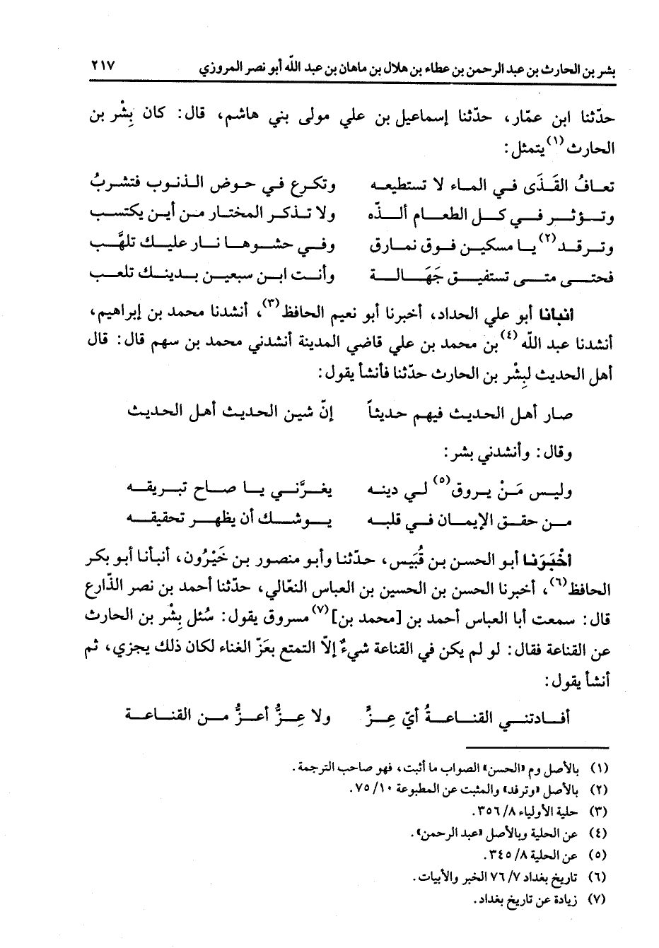 حدثنا ابن عمار حدثنا إسماعيل بن علي مولى بني هاشم قال كان بشر بن الحارث (1) يتمثل * تعاف القذى في الماء لا تستطيعه * وتكرع في حوض الذنوب فتشرب وتؤثر في كل الطعام ألذه * ولا تذكر المختار من أين يكتسب وترقد (2) يا مسكين فوق نمارق * وفي حشوها نار عليك تلهب فحتى متى تستفيق جهالة * وأنت ابن سبعين بدينك تلعب * أنبأنا أبو علي الحداد أخبرنا أبو نعيم الحافظ (3) أنشدنا محمد بن إبراهيم أنشدنا عبد الله (4) بن محمد بن علي قاضي المدينة أنشدني محمد بن سهم قال قال أهل الحديث لبشر بن الحارث حدثنا فأنشأ يقول * صار أهل الحديث فيهم حديثا * إن شين الحديث أهل الحديث * وقال وأنشدني بشر * وليس من يروق (5) لي دينه * يغرني يا صاح تبريقه من حقق الإيمان في قلبه * يوشك أن يظهر تحقيقه * أخبرنا أبو الحسن بن قبيس حدثنا وأبو منصور بن خيرون أنبأنا أبو بكر الحافظ (6) أخبرنا الحسن بن الحسين بن العباس النعالي حدثنا أحمد بن نصر الذارع قال سمعت أبا العباس أحمد بن محمد بن (7) مسروق يقول سئل بشر بن الحارث عن القناعة فقال لو لم يكن في القناعة شئ إلا التمتع بعز الغناء لكان ذلك يجزي ثم أنشأ يقول * أفادتني القناعة أي عز * ولا عز أعز من القناعة