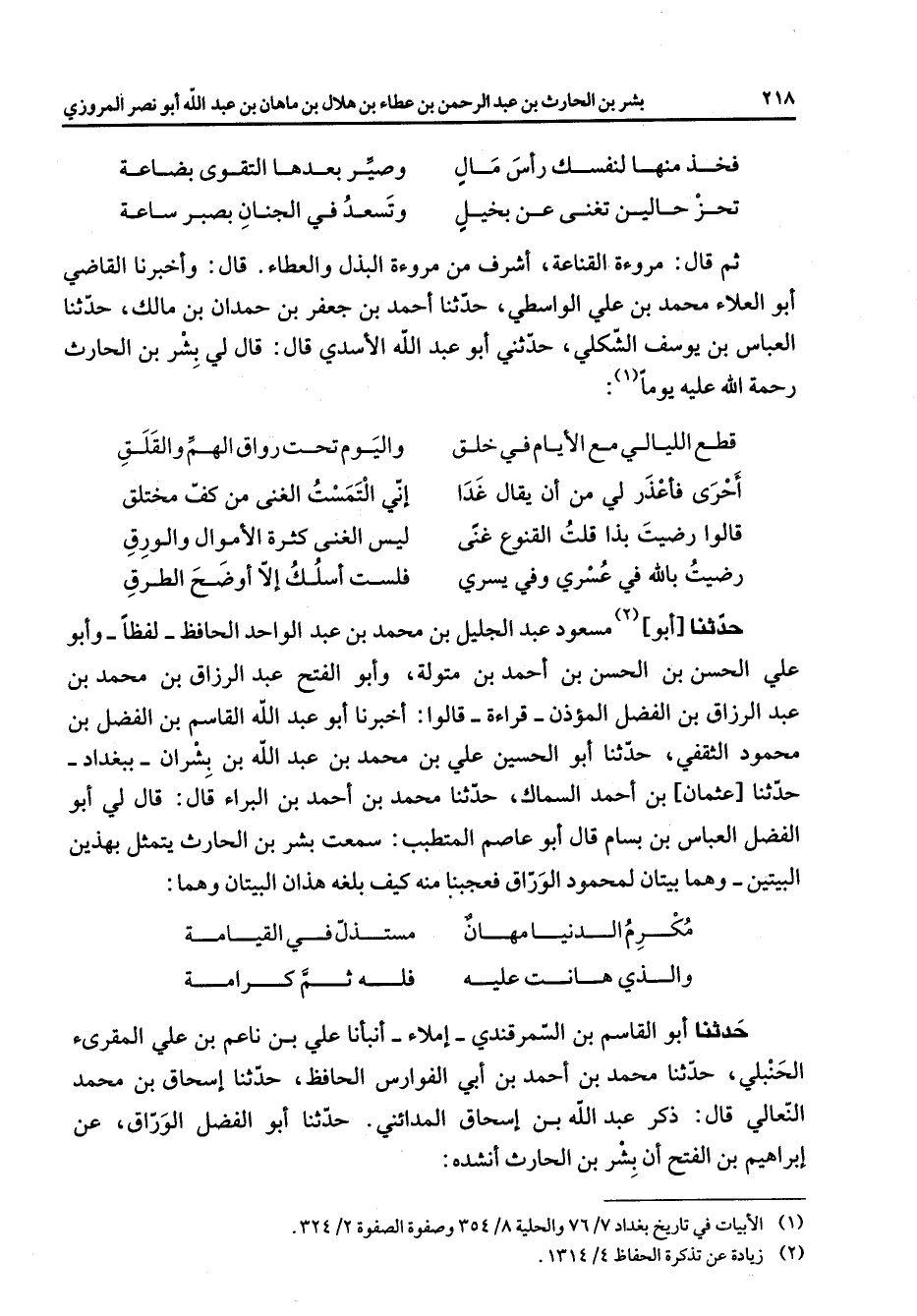 فخذ منها لنفسك رأس مال * وصير بعدها التقوى بضاعة تحز حالين تغنى عن بخيل * وتسعد في الجنان بصبر ساعة * ثم قال مروءة القناعة أشرف من مروءة البذل والعطاء قال وأخبرنا القاضي أبو العلاء محمد بن علي الواسطي حدثنا أحمد بن جعفر بن حمدان بن مالك حدثنا العباس بن يوسف الشكلي حدثنا أبو عبد الله الأسدي قال قال لي بشر بن الحارث رحمة الله عليه يوما (1) * قطع الليالي مع الأيام في خلق * واليوم تحت رواق الهم والقلق أحرى فأعذر لي من أن يقال غدا * إني التمست الغنى من كف مختلق قالوا رضيت بذا قلت القنوع غنى * ليس الغنى كثرة الأموال والورق رضيت بالله في عسري وفي يسري * فلست أسلك إلا أوضح الطرق * حدثنا أبو (2) مسعود عبد الجليل بن محمد بن عبد الواحد الحافظ لفظا وأبو علي الحسن بن الحسن بن أحمد بن متولة وأبو الفتح عبد الرزاق بن محمد بن عبد الرزاق بن الفضل المؤذن قراءة قالوا أخبرنا أبو عبد الله القاسم بن الفضل بن محمود الثقفي حدثنا أبو الحسين علي بن محمد بن عبد الله بن بشران ببغداد حدثنا عثمان بن أحمد السماك حدثنا محمد بن أحمد بن البراء قال قال لي أبو الفضل العباس بن بسام قال أبو عاصم المتطبب سمعت بشر بن الحارث يتمثل بهذين البيتين وهما بيتنا لمحمود الوراق فعجبنا منه كيف بلغه هذان البيتان وهما * مكرم الدنيا مهان * مستذل في القيامة والذي هانت عليه * فله ثم كرامة * حدثنا أبو القاسم بن السمرقندي إملاء أنبأنا علي بن ناعم بن علي المقرئ الحنبلي حدثنا محمد بن أحمد بن أبي الفوارس الحافظ حدثنا إسحاق بن محمد النعالي قال ذكر عبد الله بن إسحاق المدائني حدثنا أبو الفضل الوراق عن إبراهيم بن الفتح أن بشر بن الحارث أنشده *