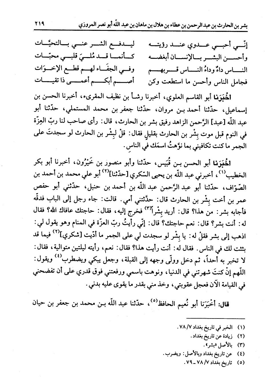 إني أحبي عدوي عند رؤيته * ليدفع الشر عني بالتحيات وأحسن البشر بالإنسان أبغضه * كأنما قد ملي قلبي محباب الناس داء وداء الناس قربهم * وفي الجفاء لهم قطع الإخوات فجامل الناس وأحسن ما استطعت وكن * أصم أبكم أعمى ذا تقيات * أخبرنا أبو القاسم العلوي أخبرنا رشأ بن نظيف المقرئ أخبرنا الحسن بن إسماعيل حدثنا أحمد بن مروان حدثنا جعفر بن محمد المستملي حدثنا أبو عبد الله عبد الرحمن الزاهد رفيق بشر بن الحارث قال رأى صاحب لنا رب العزة في النوم قبل موت بشر بن الحارث بقليل فقال قل لبشر بن الحارث لو سجدت على الجمر ما كنت تكافيني بما نوهت اسمك في الناس أخبرنا أبو الحسن بن قبيس حدثنا وأبو منصور بن خيرون أخبرنا أبو بكر الخطيب (1) أخبرني عبد الله بن يحيى السكري حدثنا (2) أبو علي محمد بن أحمد بن الصواف حدثنا أبو عبد الرحمن عبد الله بن أحمد بن حنبل حدثني أبو حفص عمر بن أخت بشر بن الحارث قال حدثتني أمي قالت جاء رجل إلى الباب فدقه فأجابه بشر من هذا قال أريد بشرا (3) فخرج إليه فقال حاجتك عافاك الله فقال له أنت بشر قال نعم حاجتك قال إني رأيت رب العزة في المنام وهو يقول لي اذهب إلى بشر فقل له يا بشر لو سجدت لي على الجمر ما أديت شكري (2) فيما قد بثثت لك في الناس فقال له أنت رأيت هذا فقال نعم رأيته ليليتين متوالية فقال لا تخبر به أحدا ثم دخل وولى وجهه إلى القبلة وجعل يبكي ويضطرب (4) ويقول اللهم إن كنت شهرتني في الدنيا ونوهت باسمي ورفعتني فوق قدري على أن تفضحني في القيامة الآن فعجل عقوبتي وخذ مني بقدر ما يقوى عليه بدني قال أخبرنا أبو نعيم الحافظ (5) حدثنا عبد الله بن محمد بن جعفر بن حيان