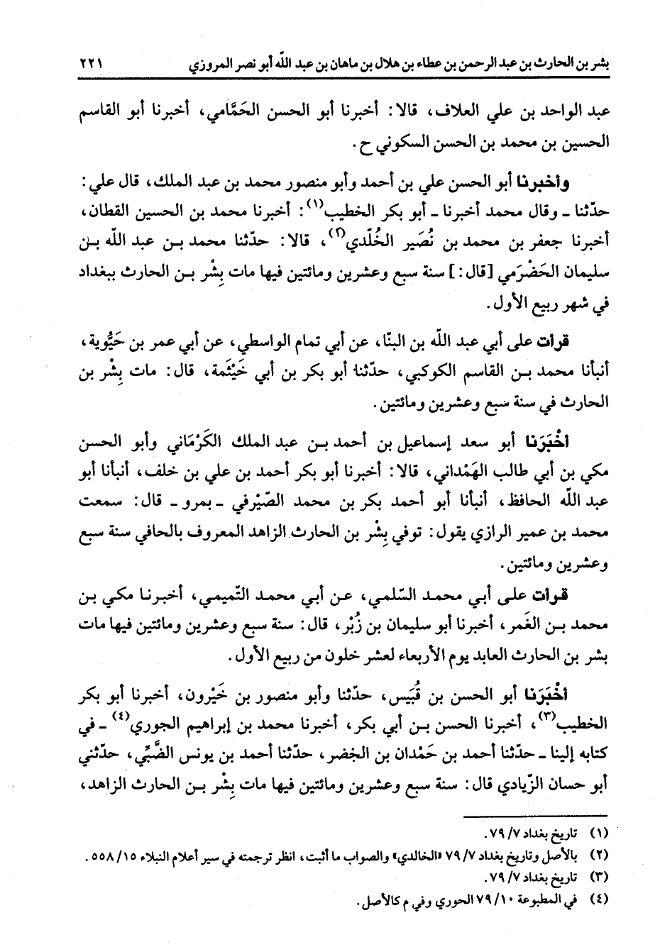 عبد الواحد بن علي العلاف قالا أخبرنا أبو الحسن الحمامي أخبرنا أبو القاسم الحسين بن محمد بن الحسن السكوني وأخبرنا أبو الحسن علي بن أحمد وأبو منصور محمد بن عبد الملك قال علي حدثنا وقال محمد أخبرنا أبو بكر الخطيب (1) أخبرنا محمد بن الحسين القطان أخبرنا جعفر بن محمد بن نصير الخلدي (2) قالا حدثنا محمد بن عبد الله بن سليمان الحضرمي قال سنة سبع وعشرين ومائتين فيها مات بشر بن الحارث ببغداد في شهر ربيع الأول قرأت على أبي عبد الله بن البنا عن أبي تمام الواسطي عن أبي عمر بن حيوية أنبأنا محمد بن القاسم الكوكبي حدثنا أبو بكر بن أبي خثيمة قال مات بشر بن الحارث في سنة سبع وعشرين ومائتين أخبرنا أبو سعد إسماعيل بن أحمد بن عبد الملك الكرماني وأبو الحسن مكي بن أبي طالب الهمداني قالا أخبرنا أبو بكر أحمد بن علي بن خلف أنبأنا أبو عبد الله الحافظ أنبأنا أبو أحمد بكر بن محمد الصيرفي بمرو قال سمعت محمد بن عمير الرازي يقول توفي بشر بن الحارث الزاهد المعروف بالحافي سنة سبع وعشرين ومائتين قرأت على أبي محمد السلمي عن أبي محمد التميمي أخبرنا مكي بن محمد بن الغمر أخبرنا أبو سليمان بن زبر قال سنة سبع وعشرين ومائتين فيها مات بشر بن الحارث العابد يوم الأربعاء لعشر خلون من ربيع الأول أخبرنا أبو الحسن بن قبيس حدثنا وأبو منصور بن خيرون أخبرنا أبو بكر الخطيب (3) أخبرنا الحسن بن أبي بكر أخبرنا محمد بن إبراهيم الجوري (4) في كتابه إلينا حدثنا أحمد بن حمدان بن الخضر حدثنا أحمد بن يونس الضبي حدثني أبو حسان الزيادي قال سنة سبع وعشرين ومائتين فيها مات بشر بن الحارث الزاهد