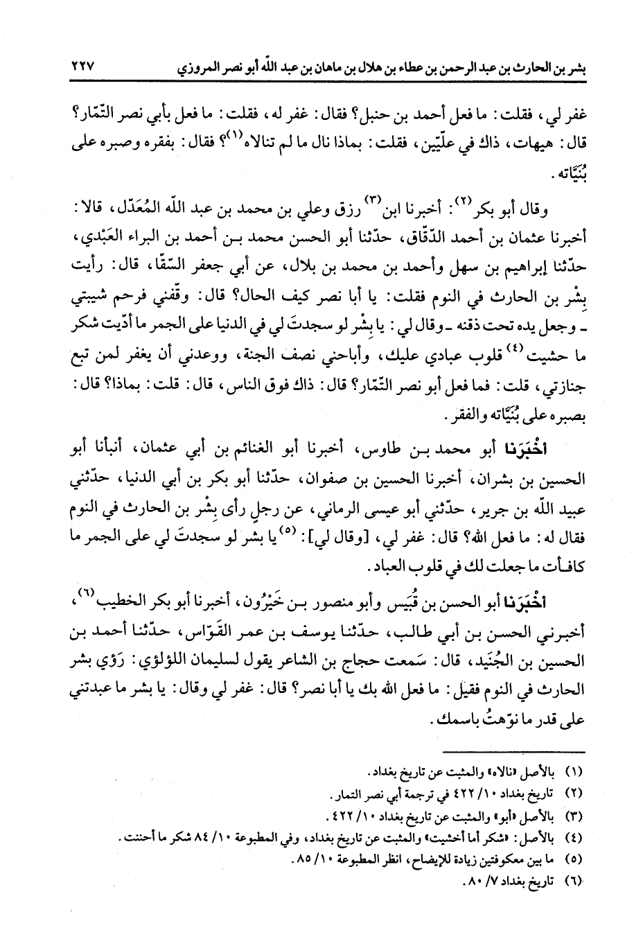 غفر لي فقلت ما فعل أحمد بن حنبل فقال غفر له فقلت ما فعل بأبي نصر التمار قال هيهات ذاك في عليين فقلت بماذا نال ما لم تنالاه (1) فقال بفقره وصبره على بنياته وقال أبو بكر (2) أخبرنا ابن (3) رزق وعلي بن محمد بن عبد الله المعدل قالا أخبرنا عثمان بن أحمد الدقاق حدثنا أبو الحسن محمد بن أحمد بن البراء العبدي حدثنا إبراهيم بن سهل وأحمد بن محمد بن بلال عن أبي جعفر السقا قال رأيت بشر بن الحارث في النوم فقلت يا أبا نصر كيف الحال قال وقفني فرحم شيبتي وجعل يده تحت ذقنه وقال لي يا بشر لو سجدت لي في الدنيا على الجمر ما أديت شكر ما حشيت (4) قلوب عبادي عليك وأباحني نصف الجنة ووعدني أن يغفر لمن تبع جنازتي قلت فما فعل أبو نصر التمار قال ذاك فوق الناس قال قلت بماذا قال بصبره على بنياته والفقر أخبرنا أبو محمد بن طاوس أخبرنا أبو الغنائم بن أبي عثمان أنبأنا أبو الحسين بن بشران أخبرنا الحسين بن صفوان حدثنا أبو بكر بن أبي الدنيا حدثني عبيد الله بن جرير حدثني أبو عيسى الرماني عن رجل رأى بشر بن الحارث في النوم فقال له ما فعل الله قال غفر لي وقال لي (5) يا بشر لو سجدت لي على الجمر ما كافات ما جعلت لك في قلوب العباد أخبرنا أبو الحسن بن قبيس وأبو منصور بن خيرون أخبرنا أبو بكر الخطيب (6) أخبرني الحسن بن أبي طالب حدثنا يوسف بن عمر القواس حدثنا أحمد بن الحسين بن الجنيد قال سمعت حجاج بن الشاعر يقول لسليمان اللؤلؤي رؤي بشر الحارث في النوم فقيل ما فعل الله بك يا أبا نصر قال غفر لي وقال يا بشر ما عبدتني على قدر ما نوهت باسمك