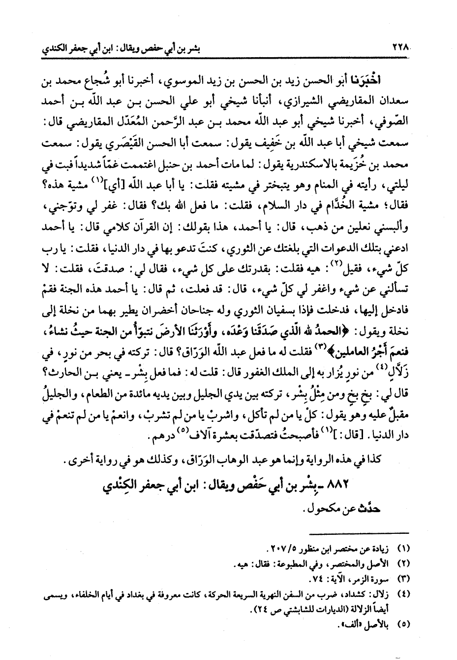 أخبرنا أبو الحسن زيد بن الحسن بن زيد الموسوي أخبرنا أبو شجاع محمد بن سعدان المقاريضي الشيرازي أنبأنا شيخي أبو علي الحسن بن عبد الله بن أحمد الصوفي أخبرنا شيخي أبو عبد الله محمد بن عبد الرحمن المعدل المقاريضي قال سمعت شيخي أبا عبد الله بن خفيف يقول سمعت أبا الحسن القيصري يقول سمعت محمد بن خزيمة بالاسكندرية يقول لما مات أحمد بن حنبل اغتممت غما شديدا فبت في ليلتي رأيته في المنام وهو يتبختر في مشيته فقلت يا أبا عبد الله أي (1) مشية هذه فقال مشية الخدام في دار السلام فقلت ما فعل الله بك فقال غفر لي وتوجني وألبسني نعلين من ذهب قال يا أحمد هذا بقولك إن القرآن كلامي قال يا أحمد ادعني بتلك الدعوات التي بلغتك عن الثوري كنت تدعو بها في دار الدنيا فقلت يا رب كل شئ فقيل (2) هيه فقلت بقدرتك على كل شئ فقال لي صدقت فقلت لا تسألني عن شئ واغفر لي كل شئ قال قد فعلت ثم قال يا أحمد هذه الجنة فقم فادخل إليها فدخلت فإذا بسفيان الثوري وله جناحان أخضران يطير بهما من نخلة إلى نخلة ويقول " الحمد لله الذي صدقنا وعده وأورثنا الأرض نتبوأ من الجنة حيث نشاء فنعم أجر العاملين " (3) فقلت له ما فعل عبد الله الوراق قال تركته في بحر من نور في زلال (4) من نور يزار به إلى الملك الغفور قال قلت له فما فعل بشر يعني بن الحارث قال لي بخ بخ ومن مثل بشر تركته بين يدي الجليل وبين يديه مائدة من الطعام والجليل مقبل عليه وهو يقول كل يا من لم تأكل واشرب يا من لم يشرب وانعم يا من لم تنعم في دار الدنيا قال (1) فأصبحت فتصدقت بعشرة آلاف (5) درهم كذا في هذه الرواية وإنما هو عبد الوهاب الوراق وكذلك هو في رواية أخرى