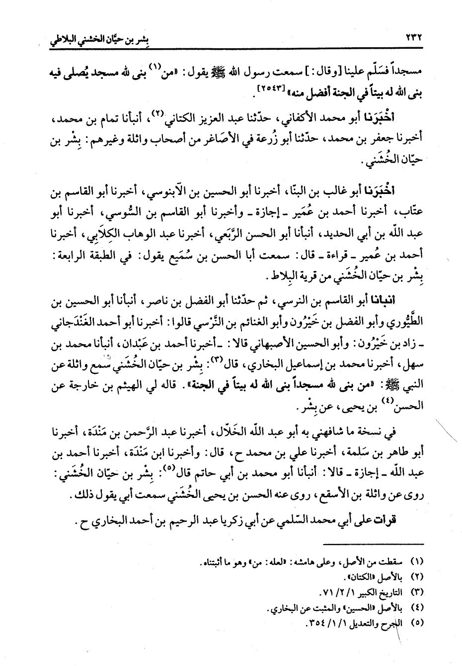 [5243] أخبرنا أبو محمد الأكفاني حدثنا عبد العزيز الكتاني (2) أنبأنا تمام بن محمد أخبرنا جعفر بن محمد حدثنا أبو زرعة في الأصاغر من أصحاب واثلة وغيرهم بشر بن حيان الخشني أخبرنا أبو غالب بن البنا أخبرنا أبو الحسين بن الآبنوسي أخبرنا أبو القاسم بن عتاب أخبرنا أحمد بن عمير إجازة وأخبرنا أبو القاسم بن السوسي أخبرنا أبو عبد الله بن أبي الحديد أنبأنا أبو الحسن الربعي أخبرنا عبد الوهاب الكلابي أخبرنا أحمد بن عمير قراءة قال سمعت أبا الحسن بن سميع يقول في الطبقة الرابعة بشر بن حيان الخشني من قرية البلاط أنبأنا أبو القاسم بن النرسي ثم حدثنا أبو الفضل بن ناصر انبأنا أبو الحسين بن الطيوري وأبو الفضل بن خيرون وأبو الغنائم بن النرسي قالوا أخبرنا أبو أحمد الغندجاني زاد بن خيرون وأبو الحسين الأصبهاني قالا أخبرنا أحمد بن عبدان أنبأنا محمد بن سهل أخبرنا محمد بن إسماعيل البخاري قال (3) بشر بن حيان الخشني سمع واثلة عن النبي (صلى الله عليه وسلم) من بنى لله مسجدا بنى الله له بيتا في الجنة قاله لي الهيثم بن خارجة عن الحسن (4) بن يحيى عن بشر في نسخة ما شافهني به أبو عبد الله الخلال أخبرنا عبد الرحمن بن مندة أخبرنا أبو طاهر بن سلمة أخبرنا علي بن محمد قال وأخبرنا ابن مندة أخبرنا أحمد بن عبد الله إجازة قالا أنبأنا أبو محمد بن أبي حاتم قال (5) بشر بن حيان الخشني روى عن واثلة بن الأسقع روى عنه الحسن بن يحيى الخشني سمعت أبي يقول ذلك قرأت على أبي محمد السلمي عن أبي زكريا عبد الرحيم بن أحمد البخاري