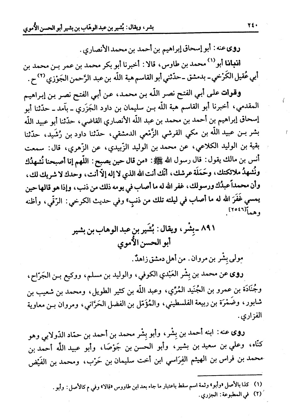 891 - بشر ويقال بشير بن عبد الوهاب بن بشير أبو الحسن الأموي مولى بشر بن مروان من أهل دمشق زاهد روى عن محمد بن بشر العبدي الكوفي والوليد بن مسلم ووكيع بن الجراح وجنادة بن عمرو بن الجنيد المري وعبد الله بن كثير الطويل ومحمد بن شعيب بن شابور وضمرة بن ربيعة الفلسطيني والمؤمل بن الفضل الحراني ومروان بن معاوية الفزاري روى عنه ابنه أحمد بن بشر وأبو بشر محمد بن أحمد بن حماد الدولابي وهو كناه وعلي بن سعيد بن بشير وأبو الحسن بن جوصا وأبو عبيد الله أحمد بن محمد بن فراس بن الهيثم الفراسي ابن أخت سليمان بن حرب ومحمد بن الفيض