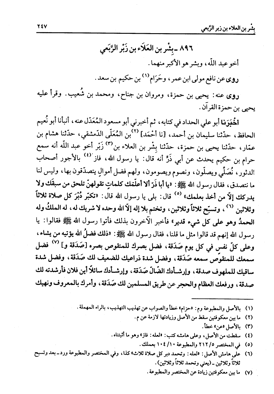 896 - بشر بن العلاء بن زبر الربعي أخو عبد الله وبشر هو الأكبر منهما روى عن نافع مولى ابن عمر وحرام (1) بن حكيم بن سعد روى عنه يحيى بن حمزة ومروان بن جناح ومحمد بن شعيب وقرأ عليه يحيى بن حمزة القرآن أخبرنا أبو علي الحداد في كتابه ثم أخبرني أبو مسعود المعدل عنه أنبأنا أبو نعيم الحافظ حدثنا سليمان بن أحمد نا أحمد (2) بن المعلى الدمشقي حدثنا هشام بن عمار حدثنا يحيى بن حمزة حدثنا بشر بن العلاء بن (3) زبر أخو عبد الله أنه سمع حرام بن حكيم يحدث عن أبي ذر أنه قال يا رسول الله فاز (4) بالأجور أصحاب الدثور نصلي ويصلون ونصوم ويصومون ولهم فضل أموال يتصدقون بها وليست لنا ما نتصدق فقال رسول الله (صلى الله عليه وسلم) يا أبا ذر ألا أعلمك كلمات تقولهن تلحق من سبقك ولا يدركك إلا من أخذ بعلمك (5) قال بلى يا رسول الله قال تكبر دبر كل صلاة ثلاثا وثلاثين (6) وتسبح ثلاثا وثلاثين وتختم بلا إله إلا الله وحده لا شريك له له الملك وله الحمد وهو على كل شئقدير فأخبر الاخرون بذلك فأتوا رسول الله (صلى الله عليه وسلم) فقالوا يا رسول الله إنهم قد قالوا مثل ما قلنا فقال رسول الله (صلى الله عليه وسلم) ذلك فضل الله يؤتيه من يشاء وعلى كل نفس في كل يوم صدقة فضل بصرك للمنقوص بصره صدقة (7) وفضل سمعك للمنقوص سمعه صدقة وفضل شدة ذراعيك للضعيف لك صدقة وفضل شدة ساقيك للملهوف صدقة وإرشادك الضال صدقة وإرشأدك سائلا أين فلان فأرشدته لك صدقة ورفعك العظام والحجر عن طريق المسلمين لك صدقة وأمرك بالمعروف ونهيك