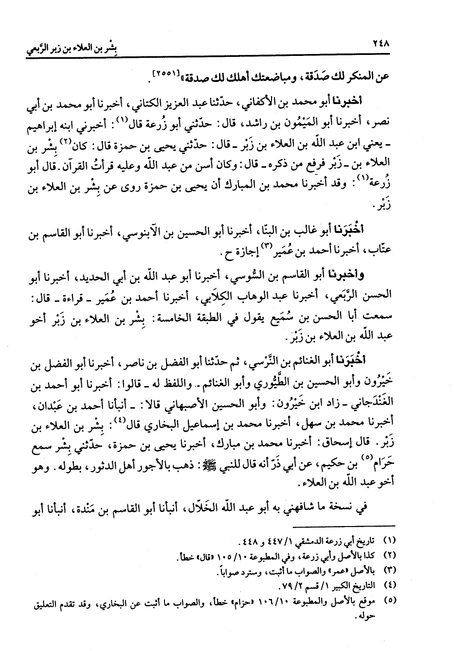 [2551] أخبرنا أبو محمد بن الأكفاني حدثنا عبد العزيز الكتاني أخبرنا أبو محمد بن أبي نصر أخبرنا أبو الميمون بن راشد قال حدثني أبو زرعة قال (1) أخبرني ابنه إبراهيم يعني ابن عبد اللبن العلاء بن زبر قال حدثني يحيى بن حمزة قال كان (2) بشر بن العلاء بن زبر فرفع من ذكره قال وكان أسن من عبد الله وعليه قرأت القرآن قال أبو زرعة (1) وقد أخبرنا محمبن المبارك أن يحيى بن حمزة روى عن بشر بن العلاء بن زبر أخبرنا أبو غالب بن البنا أخبرنا أبو الحسين بن الآبنوسي أخبرنا أبو القاسم بن عتاب أخبرنا أحمد بن عمير (3) إجازة ح وأخبرنا أبو القاسم بن السوسي أخبرنا أبو عبد الله بن أبي الحديد أخبرنا أبو الحسن الربعي أخبرنا عبد الوهاب الكلابي أخبرنا أحمد بن عمير قراءة قال سمعت أبا الحسن بن سميع يقول في الطبقة الخامسة بشر بن العلاء بن زبر أخو عبد الله بن العلاء بن زبر أخبرنا أبو الغنائم بن النرسي ثم حدثنا أبو الفضل بن ناصر أخبرنا أبو الفضل بن خيرون وأبو الحسين بن الطيوري وأبو الغنائم واللفظ له قالوا أخبرنا أبو أحمد بن الغندجاني زاد ابن خيرون وأبو الحسين الأصبهاني قالا أنبأنا أحمد بن عبدان أخبرنا محمد بن سهل أخبرنا محمد بن إسماعيل البخاري قال (4) بشر بن العلاء بن زبر قال إسحاق أخبرنا محمد بن مبارك أخبرنا يحيى بن حمزة حدثني بشر سمع حرام (5) بن حكيم عن أبي ذر أنه قال للنبي (صلى الله عليه وسلم) ذهب بالأجور أهل الدثور بطوله وهو أخو عبد الله بن العلاء في نسخة ما شافهني به أبو عبد الله الخلال أنبأنا أبو القاسم بن مندة أنبأنا أبو