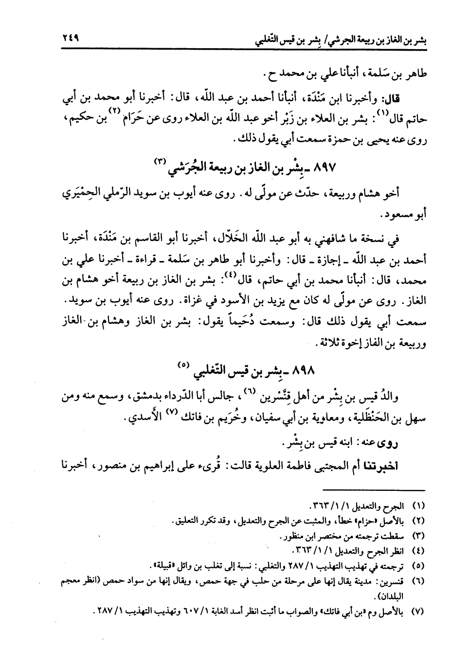897 - بشر بن الغاز بن ربيعة الجرشي (3) أخو هشام وربيعة حدث عن مولى له روى عنه أيوب بن سويد الرملي الحميري أبو مسعود في نسخة ما شافهني به أبو عبد الله الخلال أخبرنا أبو القاسم بن مندة أخبرنا أحمد بن عبد الله إجازة قال وأخبرنا أبو طاهر بن سلمة قراءة أخبرنا علي بن محمد قال أنبأنا محمد بن أبي حاتم قال (4) بشر بن الغاز بن ربيعة أخو هشام بن الغاز روى عن مولى له كان مع يزيد بن الأسود في غزاة روى عنه أيوب بن سويد سمعت أبي يقول ذلك قال وسمعت دحيما يقول بشر بن الغاز وهشام بن الغاز وربيعة بن الفاز إخوة ثلاثة
