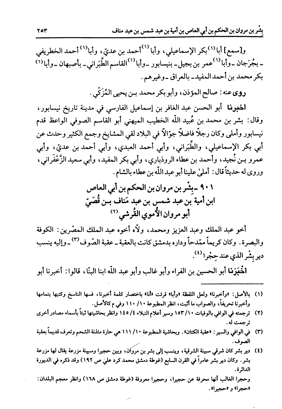901 - بشر بن مروان بن الحكم بن أبي العاص ابن أمية بن عبد شمس بن عبد مناف بن قصي أبو مروان الأموي القرشي (2) أخو عبد الملك وعبد العزيز ومحمد ولاه أخوه عبد الملك المصرين الكوفة والبصرة وكان كريما ممدحا وداره بدمشق كانت بالعقبة عقبة الصوف (3) وإليه ينسب دير بشر الذي عند حجرا (4) أخبرنا أبو الحسين بن الفراء وأبو غالب وأبو عبد الله ابنا البنا قالوا أخبرنا أبو