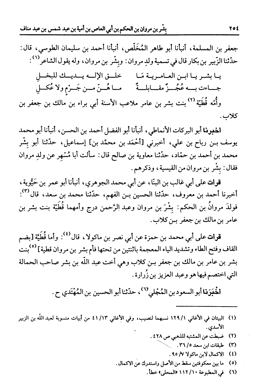 جعفر بن المسلمة أنبأنا أبو طاهر المخلص أنبأنا أحمد بن سليمان الطوسي قال حدثنا الزبير بن بكار قال في تسمية ولد مروان وبشر بن مروان وله يقول الشاعر (1) * يا بشر يا ابن العامرية ما * خلق الإله يديك للبخل جاءت به عجز مقابلة * ما هن من جرم ولا عكل * وأمه قطية (2) بنت بشر بن عامر ملاعب الأسنة أبي براء بن مالك بن جعفر بن كلاب أخبرنا أبو البركات الأنماطي أنبانا أبو الفضل أحمد بن الحسن أنبأنا أبو محمد يوسف بن رباح بن علي أخبرني أحمد بن محمد بن إسماعيل حدثنا أبو بشر محمد بن أحمد بن حماحدثنا معاوية بن صالح قال سألت أبا مسهر عن ولد مروان فقال بشر بن مروان من القيسية وذكرهم قرأت على أبي غالب بن البنا عن أبي محمد الجوهري أنبأنا أبو عمر بن حيوية أخبرنا أحمد بن معروف حدثنا الحسين بن الفهم حدثنا محمد بن سعد قال (3) فولد مروان بن الحكم بشر بن مروان وعبد الرحمن درج وأمهما قطية بنت بشر بن عامر بن مالك بن جعفر بن كلاب قرأت على أبي محمد بن حمزة عن أبي نصر بن ماكولا قال (4) وأما قطية بضم القاف وفتح الطاء وتشديد الياء المعجمة باثنتين من تحتها فأم بشر بن مروان قطية (5) بنت بشر بن عامر بن مالك بن جعفر بن كلاب وهي أخت عبد الله بن بشر صاحب الحمالة التي اختصم فيها هو وعبد العزيز بن زرارة أخبرنا أبو السعود بن المجلي (6) حدثنا أبو الحسين بن المهتدي ح
