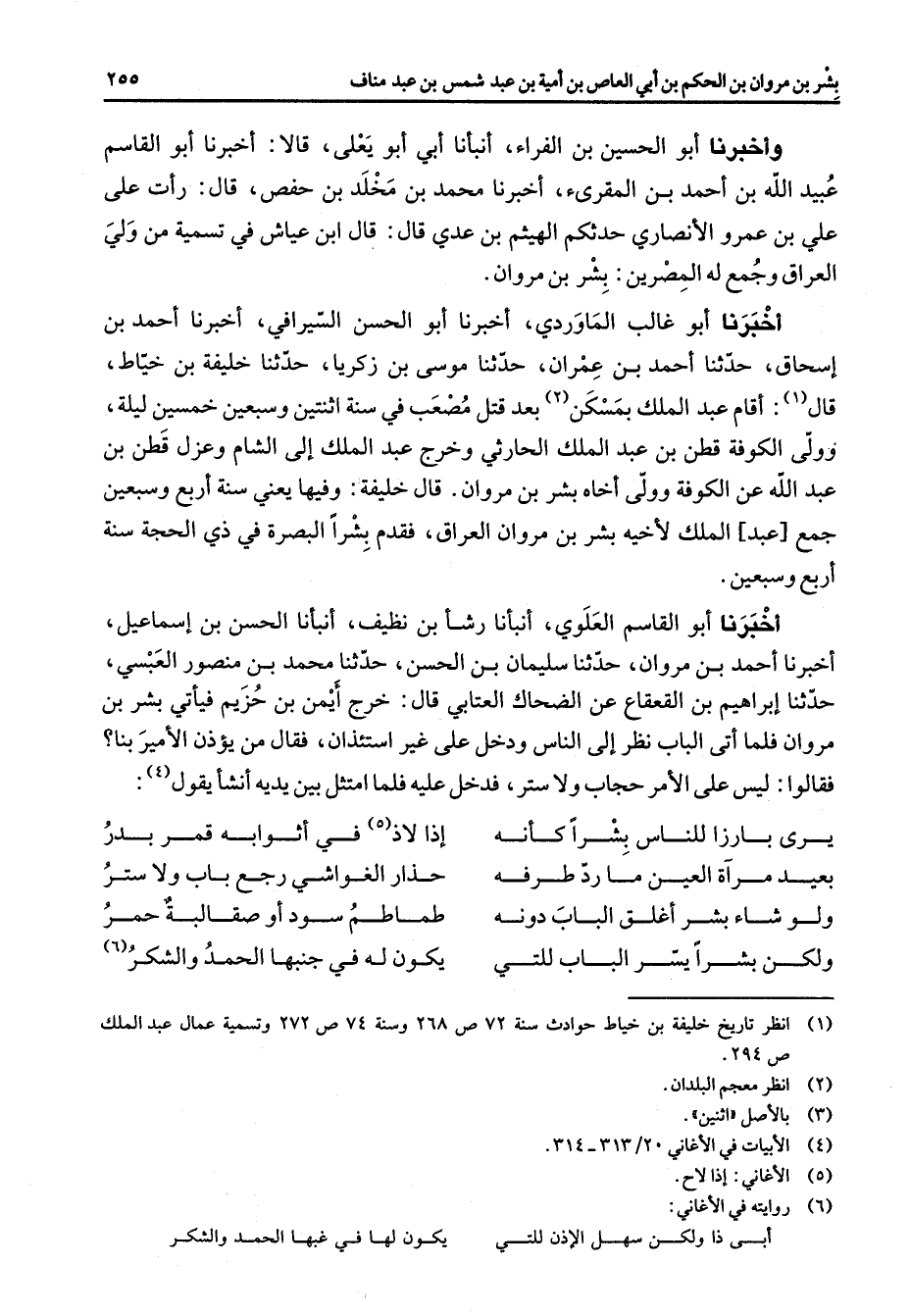 وأخبرنا أبو الحسين بن الفراء أنبأنا أبي أبو يعلى قالا أخبرنا أبو القاسم عبيد الله بن أحمد بن المقرئ أخبرنا محمد بن مخلد بن حفص قال رأت على علي بن عمرو الأنصاري حدثكم الهيثم بن عدي قال قال ابن عياش في تسمية من ولي العراق وجمع له المصرين بشر بن مروان أخبرنا أبو غالب الماوردي أخبرنا أبو الحسن السيرافي أخبرنا أحمد بن إسحاق حدثنا أحمد بن عمران حدثنا موسى بن زكريا حدثنا خليفة بن خياط قال (1) أقام عبد الملك بمسكن (2) بعد قتل مصعب في سنة اثنتين وسبعين خمسين ليلة وولى الكوفة قطن بن عبد الملك الحارثي وخرج عبد الملك إلى الشام وعزل قطن بن عبد الله عن الكوفة وولى أخاه بشر بن مروان قال خليفة وفيها يعني سنة أربع وسبعين جمع عبد الملك لأخيه بشر بن مروان العراق فقدم بشرا البصرة في ذي الحجة سنة أربع وسبعين أخبرنا أبو القاسم العلوي أنبأنا رشأ بن نظيف أنبأنا الحسن بن إسماعيل أخبرنا أحمد بن مروان حدثنا سليمان بن الحسن حدثنا محمد بن منصور العبسي حدثنا إبراهيم بن القعقاع عن الضحاك العتابي قال خرج أيمن بن حزيم فيأتي بشر بن مروان فلما أتى الباب نظر إلى الناس ودخل على غير استئذان فقال من يؤذن الأميبنا فقالوا ليس على الأمر حجاب ولا ستر فدخل عليه فلما امتثل بين يديه أنشأ يقول (4) * يرى بارزا للناس بشرا كأنه * إذا لاذ (5) في أثوابه قمر بدر بعيد مرآة العين ما رد طرفه * حذار الغواشي رجع باب ولا ستر ولو شاء بشر أغلق الباب دونه * طماطم سود أو صقالبة حمر ولكن بشرا يسر الباب للتي * يكون له في جبنها الحمد والشكر (6)