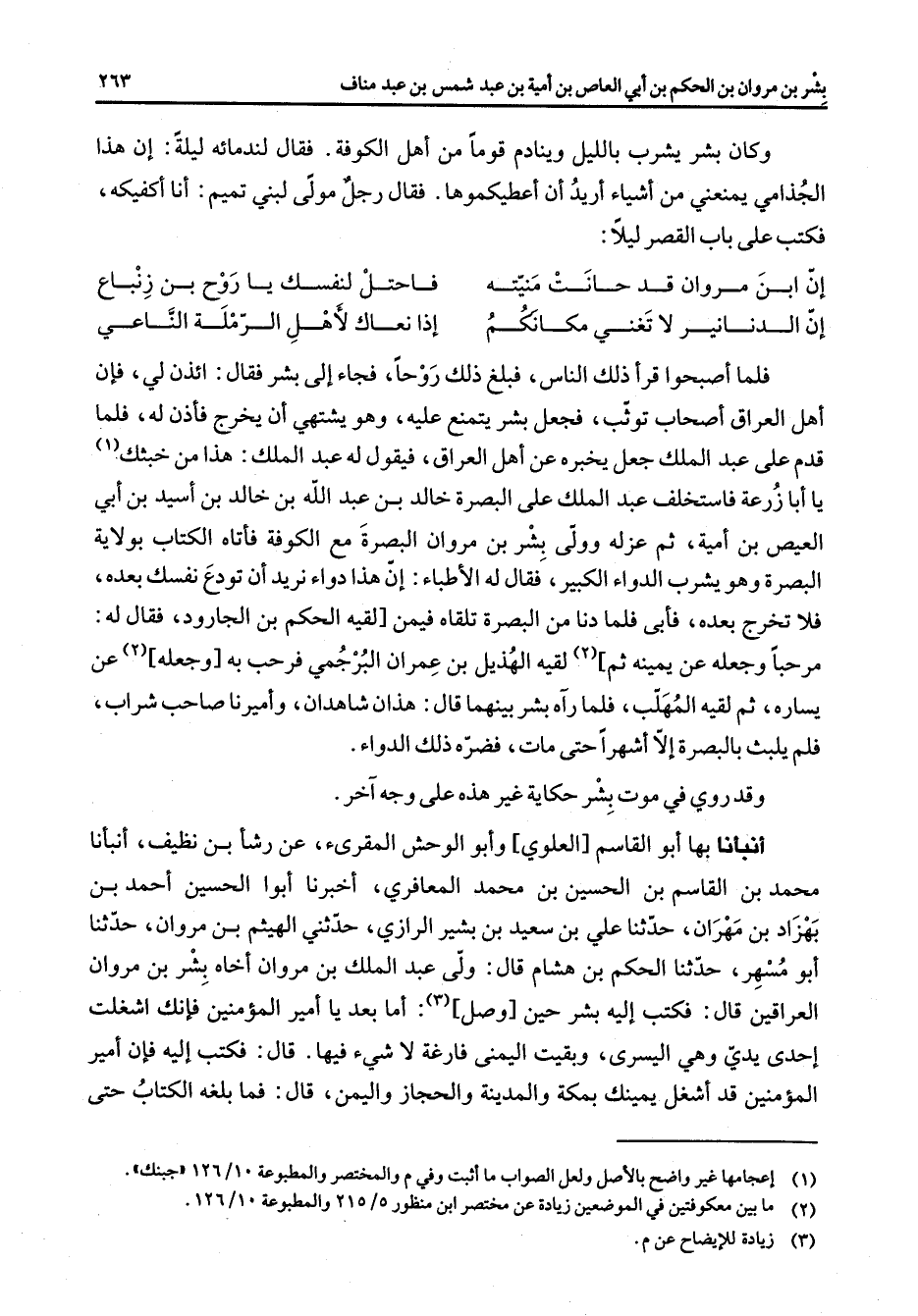 وكان بشر يشرب بالليل وينادم قوما من أهل الكوفة فقال لندمائه ليلة إن هذا الجذامي يمنعني من أشياء أريد أن أعطيكموها فقال رجل مولى لبني تميم أنا أكفيكه فكتب على باب القصر ليلا * إن ابن مروان قد حانت منيته * فاحتل لنفسك يا روح بن زنباع إن الدنانير لا تغني مكانكم * إذا نعاك لأهل الرملة الناعي * فلما أصبحوا قرأ ذلك الناس فبلغ ذلك روحا فجاء إلى بشر فقال ائذن لي فإن أهل العراق أصحاب توثب فجعل بشر يتمنع عليه وهو يشتهي أن يخرج فأذن له فلما قدم على عبد الملك جعل يخبره عن أهل العراق فيقول له عبد الملك هذا من خبثك (1) يا أبا زرعة فاستخلف عبد الملك على البصرة خالد بن عبد الله بن خالد بن أسيد بن أبي العيص بن أمية ثم عزله وولى بشر بن مروان البصرة مع الكوفة فأتاه الكتاب بولاية البصرة وهو يشرب الدواء الكبير فقال له الأطباء إن هذا دواء نريد أن تودع نفسك بعده فلا تخرج بعده فأبى فلما دنا من البصرة تلقاه فيمن لقيه الحكم بن الجارود فقال له مرحبا وجعله عن يمينه ثم (2) لقيه الهذيل بن عمران البرجمي فرحب به وجعله (2) عن يساره ثم لقيه المهلب فلما رآه بشر بينهما قال هذان شاهدان وأميرنا صاحب شراب فلم يلبث بالبصرة إلا أشهرا حتى مات فضره ذلك الدواء وقد روي في موت بشر حكاية غير هذه على وجه آخر أنبأنا بها أبو القاسم العلوي وأبو الوحش المقرئ عن رشأ بن نظيف أنبأنا محمد بن القاسم بن الحسين بن محمد المعافري أخبرنا أبوا الحسين أحمد بن بهزاد بن مهران حدثنا علي بن سعيد بن بشير الرازي حدثني الهيثم بن مروان حدثنا أبو مسهر حدثنا الحكم بن هشام قال ولى عبد الملك بن مروان أخاه بشر بن مروان العراقين قال فكتب إليه بشر حين وصل (3) أما بعد يا أمير المؤمنين فإنك اشغلت إحدى يدي وهي اليسرى وبقيت اليمنى فارغة لا شئ فيها قال فكتب إليه فإن أمير المؤمنين قد أشغل يمينك بمكة والمدينة والحجاز واليمن قال فما بلغه الكتاب حتى