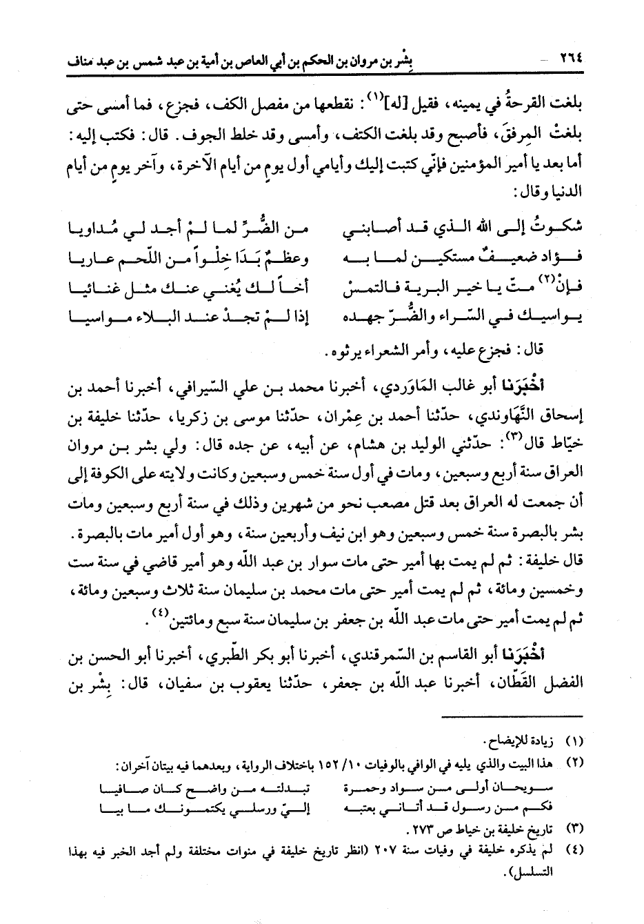 بلغت القرحة في يمنيه فقيل له (1) نقطعها من مفصل الكف فجزع فما أمسى حتى بلغت المرفق فأصبح وقد بلغت الكتف وأمسى وقد خلط الجوف قال فكتب إليه أما بعد يا أمير المؤمنين فإني كتبت إليك وأيامي أول يوم من أيام الآخرة وآخر يوم من أيام الدنيا وقال * شكوت إلى الله الذي قد أصابني * من الضر لما لم أجد لي مداويا فؤاد ضعيف مستكين لما به * وعظم بدا خلوا من اللحم عاريا فإن (2) مت يا خير البرية فالتمس * أخا لك يغني عنك مثل غنائيا يواسيك في السراء والضر جهده * إذا لم تجد عند البلاء مواسيا * قال فجزع عليه وأمر الشعراء يرثوه أخبرنا أبو غالب الماوردي أخبرنا محمد بن علي السيرافي أخبرنا أحمد بن إسحاق النهاوندي حدثنا أحمد بن عمران حدثنا موسى بن زكريا حدثنا خليفة بن خياط قال (3) حدثني الوليد بن هشام عن أبيه عن جده قال ولي بشر بن مروان العراق سنة أربع وسبعين ومات في أول سنة خمس وسبعين وكانت ولايته على الكوفة إلى أن جمعت له العراق بعد قتل مصعب نحو من شهرين وذلك في سنة أربع وسبعين ومات بشر بالبصرة سنة خمس وسبعين وهو ابن نيف وأربعين سنة وهو أول أمير مات بالبصرة قال خليفة ثم لم يمت بها أمير حتى مات سوار بن عبد الله وهو أمير قاضي في سنة ست وخمسين ومائة ثم لم يمت أمير حتى مات محمد بن سليمان سنة ثلاث وسبعين ومائة ثم لم يمت أمير حتى مات عبد الله بن جعفر بن سليمان سنة سبع ومائتين (4) أخبرنا أبو القاسم بن السمرقندي أخبرنا أبو بكر الطبري أخبرنا أبو الحسن بن الفضل القطان أخبرنا عبد الله بن جعفر حدثنا يعقوب بن سفيان قال بشر بن