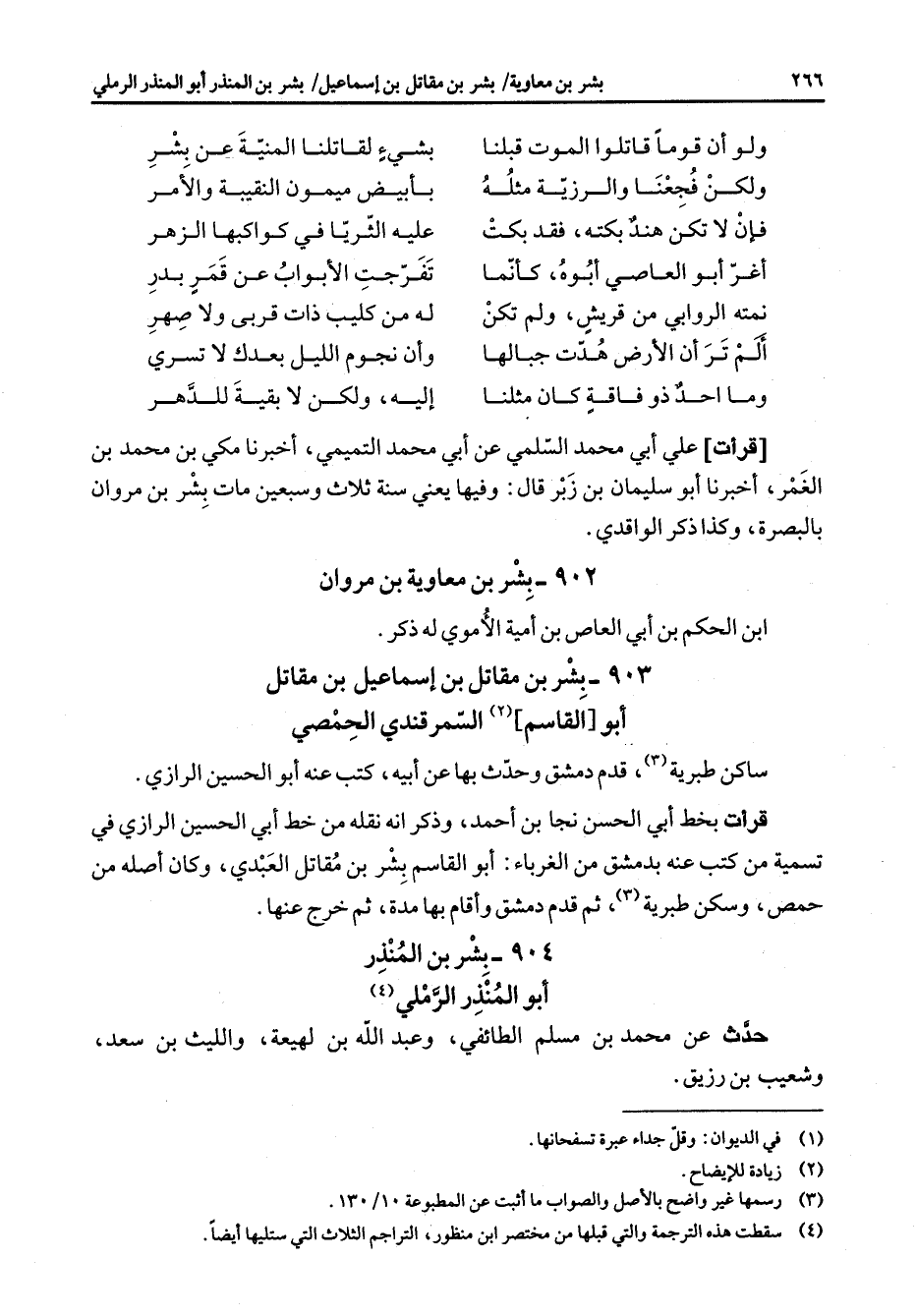 903 - بشر بن مقاتل بن إسماعيل بن مقاتل أبو القاسم (2) السمرقندي الحمصي ساكن طبرية (3) قدم دمشق وحدث بها عن أبيه كتب عنه أبو الحسين الرازي قرأت بخط أبي الحسن نجا بن أحمد وذكر أنه نقله من خلط أبي الحسين الرازي في تسمية من كتب عنه بدمشق من الغرباء أبو القاسم بشر بن مقاتل العبدي وكان أصله من حمص وسكن طبرية (3) ثم قدم دمشق وأقام بها مدة ثم خرج عنها