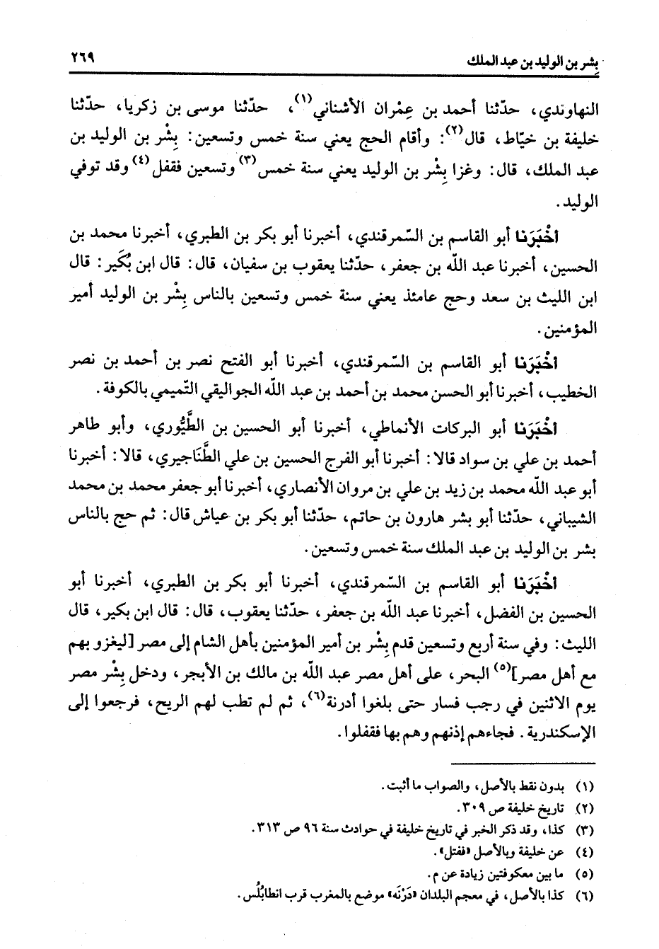 النهاوندي حدثنا أحمد بن عمران الأشناني (1) حدثنا موسى بن زكريا حدثنا خليفة بن خياط قال (2) وأقام الحج يعني سنة خمس وتسعين بشر بن الوليد بن عبد الملك قال وغزا بشر بن الوليد يعني سنة خمس (3) وتسعين فقفل (4) وقد توفي الوليد أخبرنا أبو القاسم بن السمرقندي أخبرنا أبو بكر بن الطبري أخبرنا محمد بن الحسين أخبرنا عبد الله بن جعفر حدثنا يعقوب بن سفيان قال قال ابن بكير قال ابن الليث بن سعد وحج عامئذ يعني سنة خمس وتسعين بالناس بشر بن الوليد أمير المؤمنين أخبرنا أبو القاسم بن السمرقندي أخبرنا أبو الفتح نصر بن أحمد بن نصر الخطيب أخبرنا أبو الحسن محمد بن أحمد بن عبد الله الجواليقي التميمي بالكوفة أخبرنا أبو البركات الأنماطي أخبرنا أبو الحسين بن الطيوري وأبو طاهر أحمد بن علي بن سواد قالا أخبرنا أبو الفرج الحسين بن علي الطناجيري قالا أخبرنا أبو عبد الله محمد بن زيد بن علي بن مروان الأنصاري أخبرنا أبو جعفر محمد بن محمد الشيباني حدثنا أبو بشر هارون بن حاتم حدثنا أبو بكر بن عياش قال ثم حج بالناس بشر بن الوليد بن عبد الملك سنة خمس وتسعين أخبرنا أبو القاسم بن السمرقندي أخبرنا أبو بكر بن الطبري أخبرنا أبو الحسين بن الفضل أخبرنا عبد الله بن جعفر حدثنا يعقوب قال قال ابن بكير قال الليث وفي سنة أربع وتسعين قدم بشر بن أمير المؤمنين بأهل الشام إلى مصر ليغزو بهم مع أهل مصر (5) البحر على أهل مصر عبد الله بن مالك بن الأبجر ودخل بشر مصر يوم الاثنين في رجب فسار حتى بلغوا أدرنة (6) ثم لم تطب لهم الريح فرجعوا إلى الإسكندرية فجاءهم إذنهم وهم بها فقفلوا