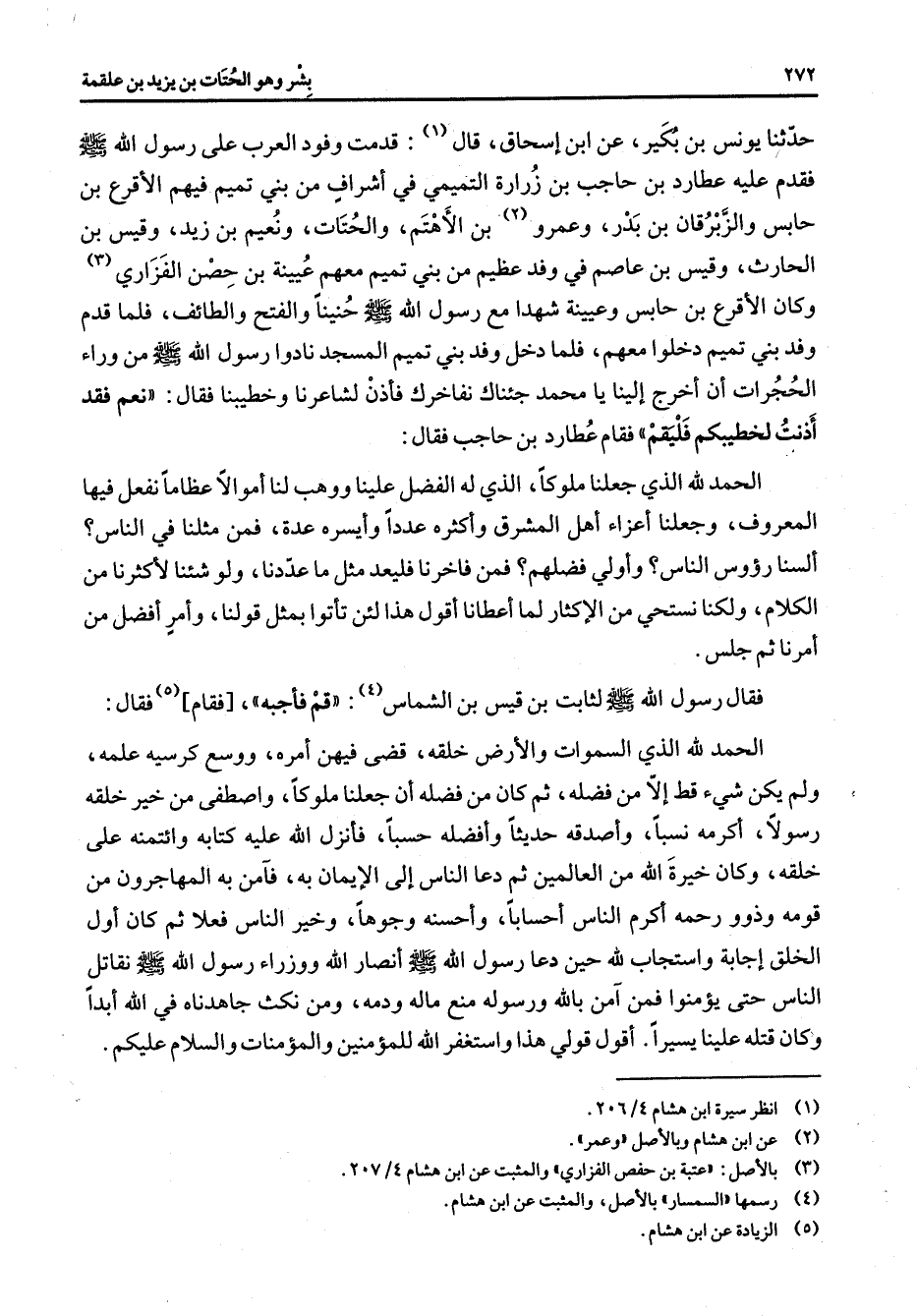 حدثنا يونس بن بكير عن ابن إسحاق قال (1) قدمت وفود العرب على رسول الله (صلى الله عليه وسلم) فقدم عليه عطارد بن حاجب بن زرارة التميمي في أشراف من بنتميم فيهم الأقرع بن حابس والزبرقان بن بدر وعمرو (2) بن الأهتم والحتات ونعيم بن زيد وقيس بن الحارث وقيس بن عاصم في وفد عظيم من بني تميم معهم عيينة بن حصن الفزاري (3) وكان الأقرع بن حابس وعيينة شهدا مع رسول الله (صلى الله عليه وسلم حنينا والفتح والطائف فلما قدم وفد بني تميم دخلوا معهم فلما دخل وفد بني تميم المسجد نادوا رسول الله (صلى الله عليه وسلم) من وراء الحجرات أن أخرج إلينا يا محمد جئناك نفاخرك فأذن لشاعرنا وخطيبنا فقال نعم فقد أذنت لخطيبكم فليقم فقام عطارد بن حاجب فقال الحمد لله الذي جعلنا ملوكا الذي له الفضل علينا ووهب لنا أموالا عظاما نفعل فيها المعروف وجعلنا أعزاء أهل المشرق وأكثرها عددا وأيسره عدة فمن مثلنا في الناس ألسنا رؤوس الناس وأولي فضلهم فمن فاخرنا فليعد مثل ما عددنا ولو شئنا لأكثرنا الكلام ولكنا نستحي من الإكثار لما أعطانا أقول هذا لئن تأتوا بمثل قولنا وأمر أفضل من أمرنا ثم جلس فقال رسول الله (صلى الله عليه وسلم) لثابت بن قيس بن الشماس (4) قم فأجبه فقام (5) فقال الحمد لله الذي السموات والأرض خلقه قضى فيهن امره ووسع كرسيه علمه ولم يكن شئ قط إلا من فضله ثم كان من فضله أن جعلنا ملوكا واصطفى من خير خلقه رسولا أكرمه نسبا وأصدقه حديثا وأفضله حسبا فأنزل الله عليه كتابه وائتمنه على خلقه وكان خيرة الله من العالمين ثم دعا الناس إلى الإيمان به فآمن به المهاجرون من قومه وذوو رحمه أكرم الناس أحسابا وأحسنه وجوها وخير الناس فعلا ثم كان أول الخلق إجابة واستجاب لله حين دعا رسول الله (صلى الله عليه وسلم) أنصار الله ووزراء رسول الله (صلى الله عليه وسلم) نقاتل الناس حتى يؤمنوا فمن آمن بالله ورسوله منع ماله ودمه ومن نكث جاهدناه في الله أبدا وكان قتله علينا يسيرا أقول قولي هذا واستغفر الله للمؤمنين والمؤمنات والسلام عليكم