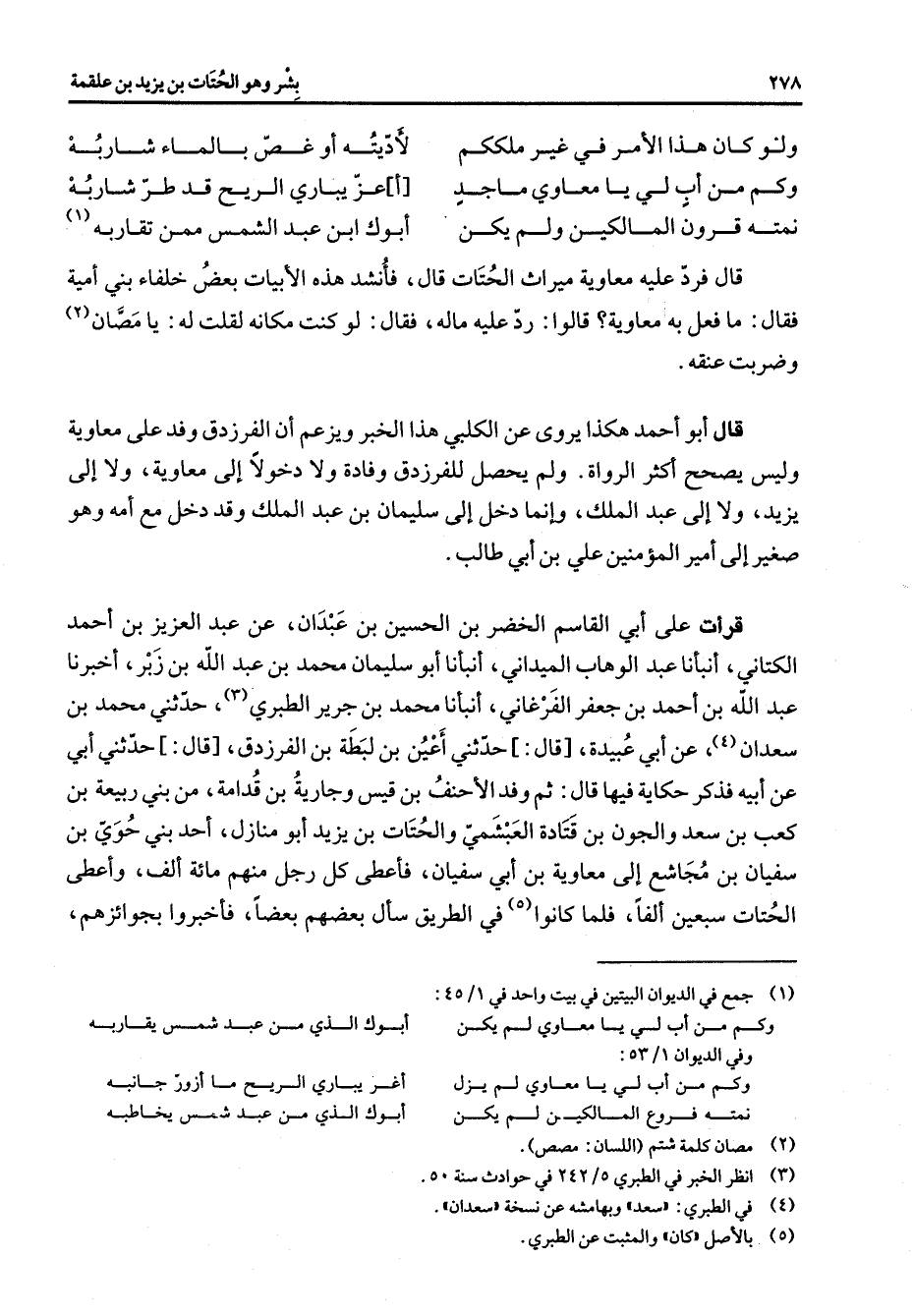 ولو كان هذا الأمر في غير ملككم * لاديته أو غص بالماء شاربه وكم من أب لي يا معاوي ماجد * أعز يباري الريح قد طر شاربه نمته قرون المالكين ولم يكن * أبوك ابن عبد الشمس ممن تقاربه (1) قال فرد عليه معاوية ميراث الحتات قال فأنشد هذه الأبيات بعض خلفاء بني أمية فقال ما فعل به معاوية قالوا رد عليه ماله فقال لو كنت فكأنه لقلت له يا مصان (2) وضربت عنقه قال أبو أحمد هكذا يروى عن الكلبي هذا الخبر ويزعم أن الفرزدق وفد على معاوية وليس يصحح أكثر الرواة ولم يحصل للفرزدق وفادة ولا دخولا إلى معاوية ولا إلى يزيد ولا إلى عبد الملك وإنما دخل إلى سليمان بن عبد الملك وقد دخل مع أمه وهو صغير إلى أمير المؤمنين علي بن أبي طالب قرأت على أبي القاسم الخضر بن الحسين بن عبدان عن عبد العزيز بن أحمد الكتاني أنبأنا عبد الوهاب الميداني أنبأنا أبو سليمان محمد بن عبد الله بن زبر أخبرنا عبد الله بن أحمد بن جعفر الفرغاني أنبأنا محمد بن جرير الطبري (3) حدثني محمد بن سعدان (4) عن أبي عبيدة قال حدثني أعين بن لبطة بن الفرزدق قال حدثني أبي عن أبيه فذكر حكاية فيها قال ثم وفد الأحنف بن قيس وجارية بن قدامة من بني ربيعة بن كعب بن سعد والجون بن قتادة العبشمي والحتات بن يزيد أبو منازل أحد بني حوي بن سفيان بن مجاشع إلى معاوية بن أبي سفيان فأعطى كل رجل منهم مائة ألف وأعطى الحتات سبعين ألفا فلما كانوا (5) في الطريق سال بعضهم بعضا فأخبروا بجوائزهم