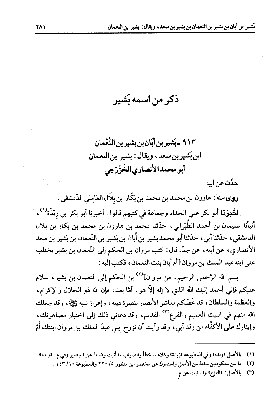 أخبرنا أبو بكر علي الحداد وجماعة في كتبهم قالوا أخبرنا أبو بكر بن ريذة (1) أنبأنا سليمان بن أحمد الطبراني حدثنا محمد بن هارون بن محمد بن بكار بن بلال الدمشقي حدثنا أبي حدثنا أبو محمد بشير بن أبان بن بشير بن النعمان بن بشير بن سعد الأنصاري عن أبيه عجده قال كتب مروان بن الحكم إلى النعمان بن بشير يخطب على ابنه عبد الملك بن مروان أم أبان بنت النعمان فكتب إليه بسم الله الرحمن الرحيم من مروان (2) بن الحكم إلى النعمان بن بشير سلام عليكم فإني أحمد إليك الله الذي لا إله إلا هو أما بعد فإن الله ذو الجلال والإكرام والعظمة والسلطان قد خصكم معاشر الأنصار بنت صرة دينه وإعزاز نبيه (صلى الله عليه وسلم) وقد جعلك الله منهم في البيت العميم والفرع (3) القديم وقد دعاني ذلك إلى اختيار مصاهرتك وإيثارك على الأكفاء من ولد أبي وقد رأيت أن تزوج ابني عبد الملك بن مروان ابنتك أم