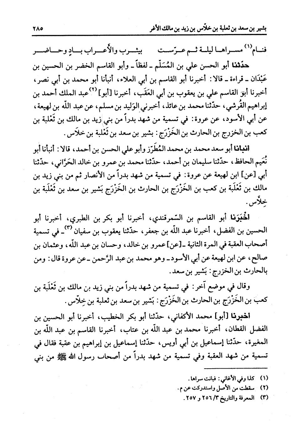 فنام (1) مسراها ليلة ثم عرست * بيثرب والأعراب باد وحاضر * حدثنا أبو الحسن علي بن المسلم لفظا وأبو القاسم الخضر بن الحسين بن عبدان قراءة قالا أخبرنا أبو القاسم بن أبي العلاء أنبأنا أبو محمد بن أبي نصر أخبرنا أبو القاسم علي بن يعقوب بن أبي العقب أخبرنا أبو (2) عبد الملك أحمد بن إبراهيم القرشي حدثنا محمد بن عائذ أخبرني الوليد بن مسلم عن عبد الله بن لهيعة عن أبي الأسود عن عروة في تسمية من شهد بدرا من بني زيد بن مالك بن ثعلبة بن كعب بن الخزرج بن الحارث بن الخزرج بشير بن سعد بن ثعلبة بن خلاس أنبأنا أبو سعد محمد بن محمد المطرز وأبو علي الحسن بن أحمد قالا أنبأنا أبو نعيم الحافظ حدثنا سليمان بن أحمد حدثنا محمد بن عمرو بن خالد الحراني حدثنا أبي عن أبن لهيعة عن عروة في تسمية من شهد بدرا من الأنصار ثم من بني زيد بن مالك بن ثعلبة بن كعب بن الخزرج بن الحارث بن الخزرج بشير بن سعد بن ثعلبة بن خلاس أخبرنا أبو القاسم بن السمرقندي أخبرنا أبو بكر بن الطبري أخبرنا أبو الحسين بن الفضل أخبرنا عبد الله بن جعفر حدثنا يعقوب بن سفيان (3) في تسمية أصحاب العقبة في المرة الثانية عن عمرو بن خالد وحسان بن عبد الله وعثمان بن صالح عن ابن لهيعة عن أبي الأسود وهو محمد بن عبد الرحمن عن عروة قال ومن بالحارث بن الخزرج بشير بن سعد وقال في موضع آخر في تسمية من شهد بدرا من بني زيد بن مالك بن ثعلبة بن كعب بن الخزرج بن الحارث بن الخزرج بشير بن سعد بن ثعلبة بن خلاس أخبرنا أبو محمد الأكفاني حدثنا أبو بكر الخطيب أخبرنا أبو الحسين بن الفضل القطان أخبرنا محمد بن عبد الله بن عتاب أخبرنا القاسم بن عبد الله بن المغيرة حدثنا إسماعيل بن أبي أويس حدثنا إسماعيل بن إبراهيم بن عقبة فقال في تسمية من شهد العقبة وفي تسمية من شهد بدرا من أصحاب رسول الله (صلى الله عليه وسلم) من بني