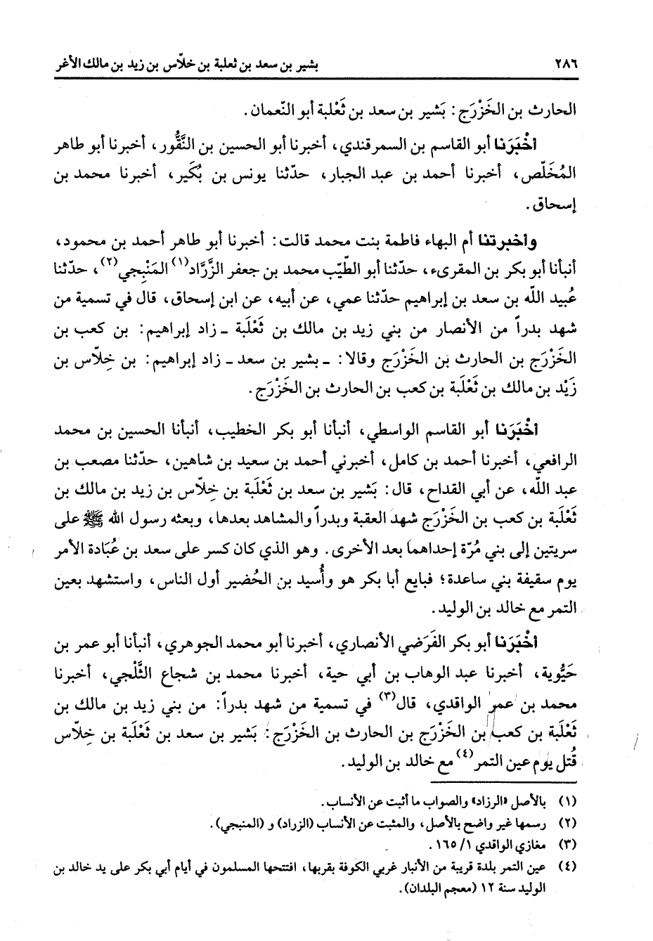 الحارث بن الخزرج بشير بن سعد بن ثعلبة أبو النعمان أخبرنا أبو القاسم بن السمرقندي أخبرنا أبو الحسين بن النقور أخبرنا أبو طاهر المخلص أخبرنا أحمد بن عبد الجبار حدثنا يونس بن بكير أخبرنا محمد بن إسحاق وأخبرتنا أم البهاء فاطمة بنت محمد قالت أخبرنا أبو طاهر أحمد بن محمود أنبأنا أبو بكر بن المقرئ حدثنا أبو الطيب محمد بن جعفر الزراد (1) المنبجي (2) حدثنا عبيد الله بن سعد بن إبراهيم حدثنا عمي عن أبيه عن ابن إسحاق قال في تسمية من شهد بدرا من الأنصار من بني زيد بن مالك بن ثعلبة زاد إبراهيم بن كعب بن الخزرج بن الحارث بن الخزرج وقالا بشير بن سعد زاد إبراهيم بن خلاس بن زيد بن مالك بن ثعلبة بن كعب بن الحارث بن الخزرج أخبرنا أبو القاسم الواسطي أنبأنا أبو بكر الخطيب أنبأنا الحسين بن محمد الرافعي أخبرنا أحمد بن كامل أخبرني أحمد بن سعيد بن شاهين حدثنا مصعب بن عبد الله عن أبي القداح قال بشير بن سعد بن ثعلبة بن خلاس بن زيد بن مالك بن ثعلبة بن كعب بن الخزرج شهد العقبة وبدرا والمشاهد بعدها وبعثه رسول الله (صلى الله عليه وسلم) على سريتين إلى بني مرة إحداهما بعد الأخرى وهو الذي كان كسر على سعد بن عبادة الأمر يوم سقيفة بني ساعدة فبايع أبا بكر هو وأسيد بن الحضير أول الناس واستشهد بعين التمر مع خالد بن الوليد أخبرنا أبو بكر الفرضي الأنصاري أخبرنا أبو محمد الجوهري أنبأنا أبو عمر بن حيوية أخبرنا عبد الوهاب بن أبي حية أخبرنا محمد بن شجاع الثلجي أخبرنا محمد بن عمر الواقدي قال (3) في تسمية من شهد بدرا من بني زيد بن مالك بن ثعلبة بن كعب بن الخزرج بن الحارث بن الخزرج بشير بن سعد بن ثعلبة بخلاس قتل يوم عين التمر (4) مع خالد بن الوليد