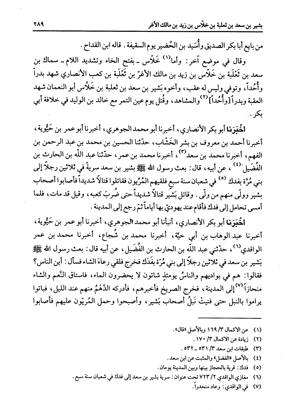 من بايع أبا بكر الصديق وأسيد بن الحضير يوم السقيفة قاله ابن القداح وقال في موضع آخر وأما (1) خلاس بفتح الخاء وتشديد اللام سماك بن سعد بن ثعلبة بن خلاس بن زيد بن مالك الأغر بن ثعلبة بن كعب الأنصاري شهد بدرا وأحدا وتوفي وليس له عقب وأخوه بشير بن سعد بن ثعلبة بن خلاس أبو النعمان شهد العقبة وبدرا وأحدا (2) والمشاهد وقتل يوم عين التمر مع خالد بن الوليد في خلافة أبي بكر أخبرنا أبو بكر الأنصاري أخبرنا أبو محمد الجوهري أخبرنا أبو عمر بن حيوية أخبرنا أحمد بن معروف بن بشر الخشاب حدثنا الحسين بن محمد بن عبد الرحمن بن الفهم أخبرنا محمد بن سعد (3) أخبرنا محمد بن عمر حدثنا عبد الله بن الحارث بن الفضيل (4) عن أبيه قال بعث رسول الله (صلى الله عليه وسلم) بشير بن سعد سرية في ثلاثين رجلا إلى بني مرة بفدك (5) في شعبان سنة سبع فلقيهم المريون فقاتلوا قتالا شديدا فأصابوا أصحاب بشير وولى منهم من ولى وقاتل بشير قتالا شديدا حتى ضرب كعبه وقيل قد مات فلما أمسى تحامل إلى فدك فأقام عند يهودي بها أياما ثم رجع إلى المدينة أخبرنا أبو بكر الأنصاري أنبأنا أبو محمد الجوهري أخبرنا أبو عمر بن حيوية أخبرنا عبد الوهاب بن أبي حية أخبرنا محمد بن شجاع أخبرنا محمد بن عمر الواقدي (6) حدثني عبد الله بن الحارث بن الفضيل عن أبيه قال بعث رسول الله (صلى الله عليه وسلم) بشير بن سعد في ثلاثين رجلا إلى بني مرة بفدك فخرج فلقي رعاء الشاء فسأل أين الناس فقالوا هم في بواديهم والناس يومئذ شاتون لا يحضرون الماء فاستاق النعم والشاء منحازا (7) إلى المدينة فخرج الصريخ فأخبرهم فأدركه الدهم منهم عند الليل فباتوا يراموا بالنبل حتى فنيت نبل أصحاب بشير وأصبحوا وحمل المريون عليهم فأصابوا