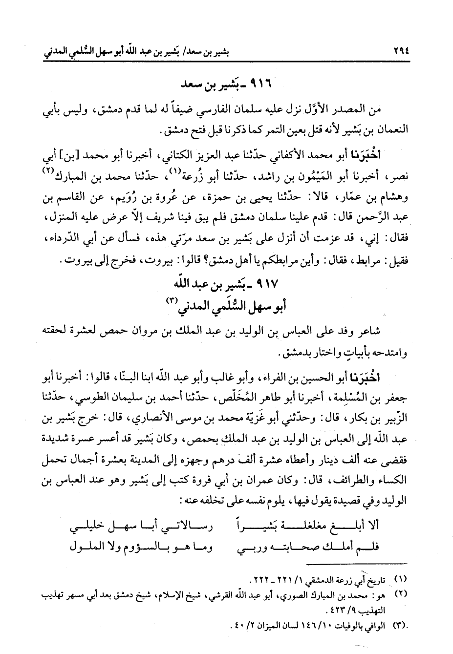 916 - بشير بن سعد من المصدر الأول نزل عليه سلمان الفارسي ضيفا له لما قدم دمشق وليس بأبي النعمان بن بشير لأنه قتل بعين التمر كما ذكرنا قبل فتح دمشق أخبرنا أبو محمد الأكفاني حدثنا عبد العزيز الكتاني أخبرنا أبو محمد بن أبي نصر أخبرنا أبو الميمون بن راشد حدثنا أبو زرعة (1) حدثنا محمد بن المبارك (2) وهشام بن عمار قالا حدثنا يحيى بن حمزة عن عروة بن رويم عن القاسم بن عبد الرحمن قال قدم علينا سلمان دمشق فلم يبق فينا شريف إلا عرض عليه المنزل فقال إني قد عزمت أن أنزل على بشير بن سعد مرتي هذه فسأل عن أبي الدرداء فقيل مرابط فقال وأين مرابطكم يا أهل دمشق قالوا بيروت فخرج إلى بيروت