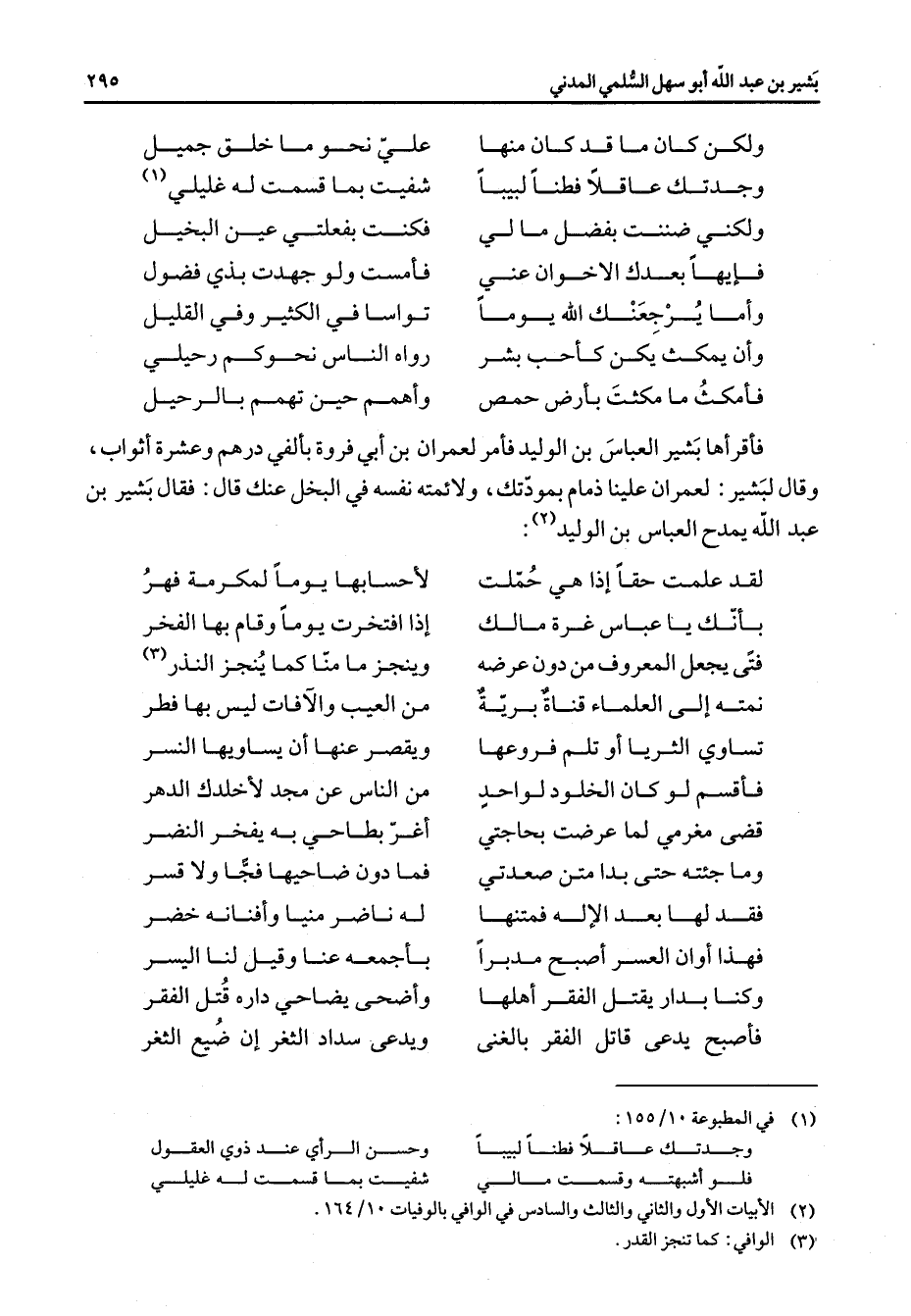 ولكن كان ما قد كان منها * علي نحو ما خلق جميل وجدتك عاقلا فطنا لبيبا * شفيت بما قسمت له غليلي (1) ولكني ضننت بفضل مالي * فكنت بفعلتي عين البخيل فإيها بعدك الاخوان عني * فأمست ولو جهدت بذي فضول * * وأما يرجعنك الله يوما * تواسا في الكثير وفي القليل وأن يمكث يكن كأحب بشر * رواه الناس نحوكم رحيلي فأمكث ما مكثت بأرض حمص * وأهمم حين تهمم بالرحيل * فأقرأها بشير العباس بن الوليد فأمر لعمران بن أبي فروة بألفي درهم وعشرة أثواب وقال لبشير لعمران علينا ذمام بمودتك ولائمته نفسه في البخل عنك قال فقال بشير بن عبد الله يمدح العباس بن الوليد (2) لقد علمت حقا إذا هي حملت * لأحسابها يوما لمكرمة فهر بأنك يا عباس غرة مالك * إذا افتخرت يوما وقا بها الفخر فتى يجعل المعروف من دون عرضه * وينجز ما منا كما ينجز النذر (3) نمته إلى العلماء قناة برية * من العيب والآفات ليس بها فطر تساوي الثريا أو تلم فروعها * ويقصر عنها أن يساويها النسر فأقسم لو كان الخلود لواحد * من الناس عن مجد لأخلدك الدهر قضى مغرمي لما عرضت بحاجتي * أغر بطاحي به يفخر النضر وما جئته حتى بدا متن صعدتي * فما دون ضاحيها فجا ولا قسر فقد لها بعد الإله فمتنها * له ناضر منيا وأفنانه خضر فهذا أوان العسر أصبح مدبرا * بأجمعه عنا وقيل لنا اليسر وكنا بدار يقتل الفقر أهلها * وأضحى يضاحي داره قتل الفقر فأصبح يدعى قاتل الفقر بالغنى * ويدعى سداد الثغر إن ضيع الثغر