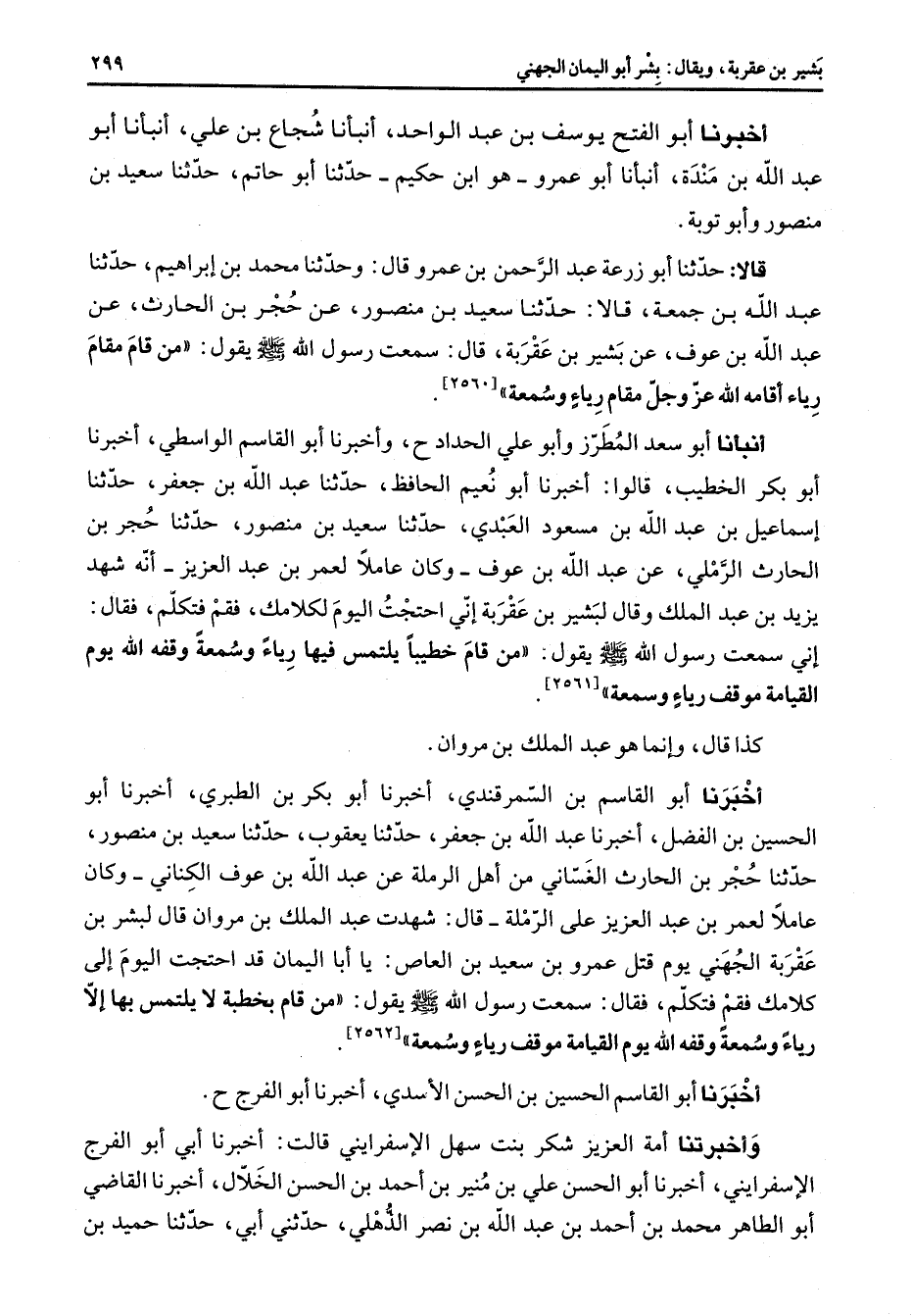 أخبرنا أبو الفتح يوسف بن عبد الواحد أنبأنا شجاع بن علي أنبأنا أبو عبد الله بن مندة أنبأنا أبو عمرو هو ابن حكيم حدثنا أبو حاتم حدثنا سعيد بن منصور وأبو توبة قالا حدثنا أبو زرعة عبد الرحمن بن عمرو قال وحدثنا محمد بن إبراهيم حدثنا عبد الله بن جمعة قالا حدثنا سعيد بن منصور عن حجر بن الحارث عن عبد الله بن عوف عن بشير بن عقربة قال سمعت رسول الله (صلى الله عليه وسلم) يقول من قام مقام رياء أقامه الله عز وجل مقام رياء وسمعة