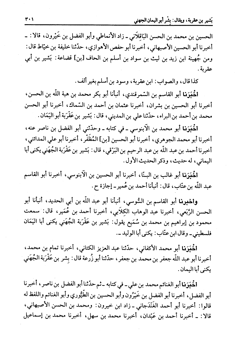الحسين بن محمد بن الحسن الباقلاني زاد الأنماطي وأبو الفضل بن خيرون قالا أخبرنا أبو الحسين الأصبهاني أخبرنا أبو حفص الأهوازي حدثنا خليفة بن خياط قال ومن جهينة ابن زيد بن ليث بن سواد بن أسلم بن الحاف بن قضاعة بشير بن أبي عقربة كذا قال والصواب ابن عقربة وسود بن أسلم بغير ألف أخبرنا أبو القاسم بن السمرقندي أنبأنا أبو بكر محمد بن هبة الله بن الحسن أخبرنا أبو الحسين بن بشران أخبرنا عثمان بن أحمد بن السماك أخبرنا أبو الحسن محمد بن أحمد بن البراء حدثنا علي بن المديني قال بشير بن عقربة أبو اليمان أخبرنا أبو محمد بن الآبنوسي في كتابه وحدثني أبو الفضل بن ناصر عنه أخبرنا أبو محمد الجوهري أخبرنا أبو الحسين بن المظفر أخبرنا أبو علي المدائني أخبرنا أحمد بن عبد الله بن عبد الرحيم بن البرقي قال بشير بن عقربة الجهني يكنى أبا اليماني له حديث وذكر الحديث الأول أخبرنا أبو غالب بن البنا أخبرنا أبو الحسين بن الآبنوسي أخبرنا أبو القاسم عبد الله بن عتاب قال أنبأنا أحمد بن عمير إجازة ح وأخبرنا أبو القاسم بن السوسي أنبأنا أبو عبد الله بن أبي الحديد أنبأنا أبو الحسن الربعي أخبرنا عبد الوهاب الكلابي أخبرنا أحمد بن عمير قال سمعت محمود بن إبراهيم بن محمد بن سميع يقول بشير بن عقربة الجهني يكنى أبا اليمان فلسطيني وقال ابن عتاب يكنى أبا الوليد أخبرنا أبو محمد الأكفاني حدثنا عبد العزيز الكتاني أخبرنا تمام بن محمد أخبرنا أبو عبد الله جعفر بن محمد بن جعفر حدثنا أبو زرعة قال بشر بن عقربة الجهني يكنى أبا اليمان أخبرنا أبو الغنائم محمد بن علي في كتابه ثم حدثنا أبو الفضل بن ناصر أخبرنا أبو الفضل أخبرنا أبو الفضل بن خيرون وأبو الحسين بن الطيوري وأبو الغنائم واللفظ له قالوا أخبرنا أبو أحمد الغندجاني زاد ابن خيرون ومحمد بن الحسن الأصبهاني قالا أخبرنا أحمد بن عبدان أخبرنا محمد بن سهل أخبرنا محمد بن إسماعيل