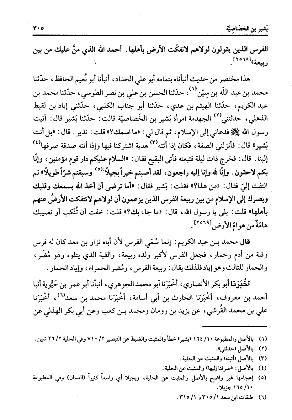 [2568] هذا مختصر من حديث أنبأناه بتمامه أبو علي الحداد أنبأنا أبو نعيم الحافظ حدثنا محمد بن عبد الله بن سين (1) حدثنا الحسن بن علي نصر الطوسي حدثنا محمد بن عبد الكريم حدثنا الهيثم بن عدي حدثنا أبو جناب الكلبي حدثني إياد بن لقيط الذهلي حدثتني (2) الجهدمة امرأة بشير بن الخصاصية قالت حدثنا بشير قال أتيت رسول الله (صلى الله عليه وسلم) فدعاني إلى الإسلام ثم قال لي ما اسمك قلت نذير قال بل أنت بشير قال فأنزلني الصفة فكان إذا أتته (3) هدية اشتركنا فيها وإذا أتته صدقة صرفها (4) إلينا قال فخرج ذات ليلة فتبعته فأتى البقيع فقال السلام عليكم دار قوم مؤمنين وإنا بكم لاحقون وإنا لله وإنا إليه راجعون لقد أصبتم خيرا بجيلا (5) وسبقتم شرا طويلا ثم التفت إلي فقال من هذا فقلت بشير فقال أما ترضى أن أخذ الله بسمعك وقلبك وبصرك إلى الإسلام من بين ربيعة الفرس الذين يزعمون أن لولاهم لائتفكت الأرض عنهم بأهلها قلت بلى يا رسول الله قال ما جاء بك قلت خفت أن تنكب أو تصيبك هامة من هوام الأرض