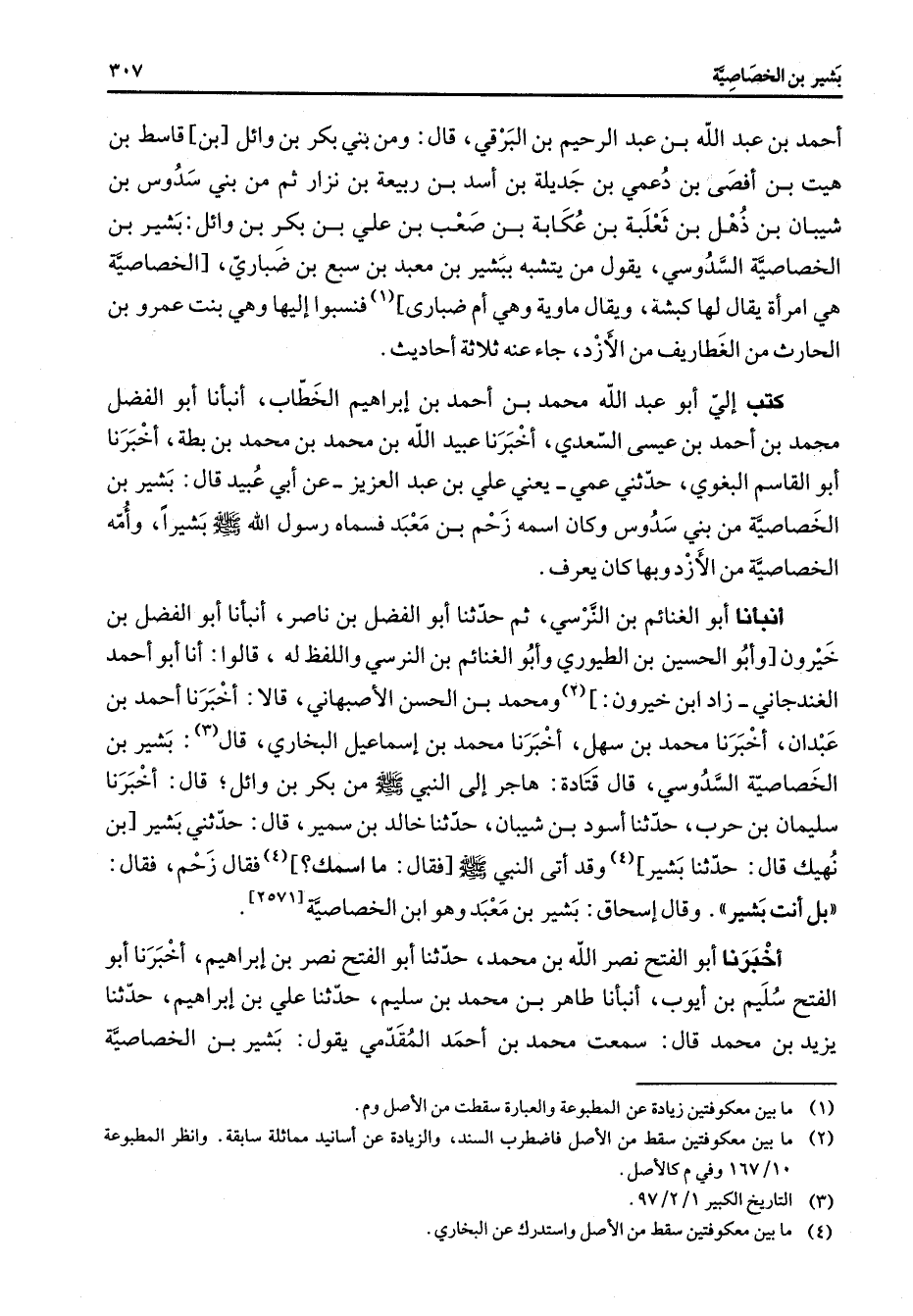 أحمد بن عبد الله بن عبد الرحيم بن البرقي قال ومن بني بكر بن وائل بن قاسط بن هيت بن أفصى بن دعمي بن جديلة بن أسد بن ربيعة بن نزار ثم من بني سدوس بن شيبان بذهل بن ثعلبة بن عكابة بن صعب بن علي بن بكر بن وائل بشير بن الخصاصية السدوسي يقول من يتشبه ببشير بن معبد بن سبع بن ضباري الخصاصية هي امرأة يقال لها كبشة ويقال ماوية وهي أم ضبارى (1) فنسبوا إليها وهي بنت عمرو بن الحارث من الغطاريف من الأزد جاء عنه ثلاثة أحاديث كتب إلي أبو عبد الله محمد بن أحمد بن إبراهيم الخطاب أنبأنا أبو الفضل محمد بن أحمد بن عيسى السعدي أخبرنا عبيد الله بن محمد بن بطة أخبرنا أبو القاسم البغوي حدثني عمي يعني علي بن عبد العزيز عن أبي عبيد قال بشير بن الخصاصية من بني سدوس وكان اسمه زحم بن معبد فسماه رسول الله (صلى الله عليه وسلم) بشيرا وأمه الخصاصية من الأزد وبها كان يعرف أنبأنا أبو الغنائم بن النرسي ثم حدثنا أبو الفضل بن ناصر أنبأنا أبو الفضل بن خيرون وأبو الحسين بن الطيوري وأبو الغنائم بن النرسي واللفظ له قالوا أنا أبو أحمد الغندجاني زاد ابن خيرون (2) ومحمد بن الحسن الأصبهاني قالا أخبرنا أحمد بن عبدان أخبرنا محمد بن سهل أخبرنا محمد بن إسماعيل البخاري قال (3) بشير بن الخصاصية السدوسي قال قتادة هاجر إلى النبي (صلى الله عليه وسلم) من بكر بن وائل قال أخبرنا سليمان بن حرب حدثنا أسود بن شيبان حدثنا خالد بن سمير قال حدثني بشير بن نهيك قال حدثنا بشير (4) وقد أتى النبي (صلى الله عليه وسلم) فقال ما اسمك (4) فقال زحم فقال بل أنت بشير وقال إسحاق بشير بن معبد وهو ابن الخصاصية أخبرنا أبو الفتح نصر الله بن محمد حدثنا أبو الفتح نصر بن إبراهيم أخبرنا أبو الفتح سليم بن أيوب أنبأنا طاهر بن محمد بن سليم حدثنا علي بن إبراهيم حدثنا يزيد بن محمد قال سمعت محمد بن أحمد المقدمي يقول بشير بن الخصاصية