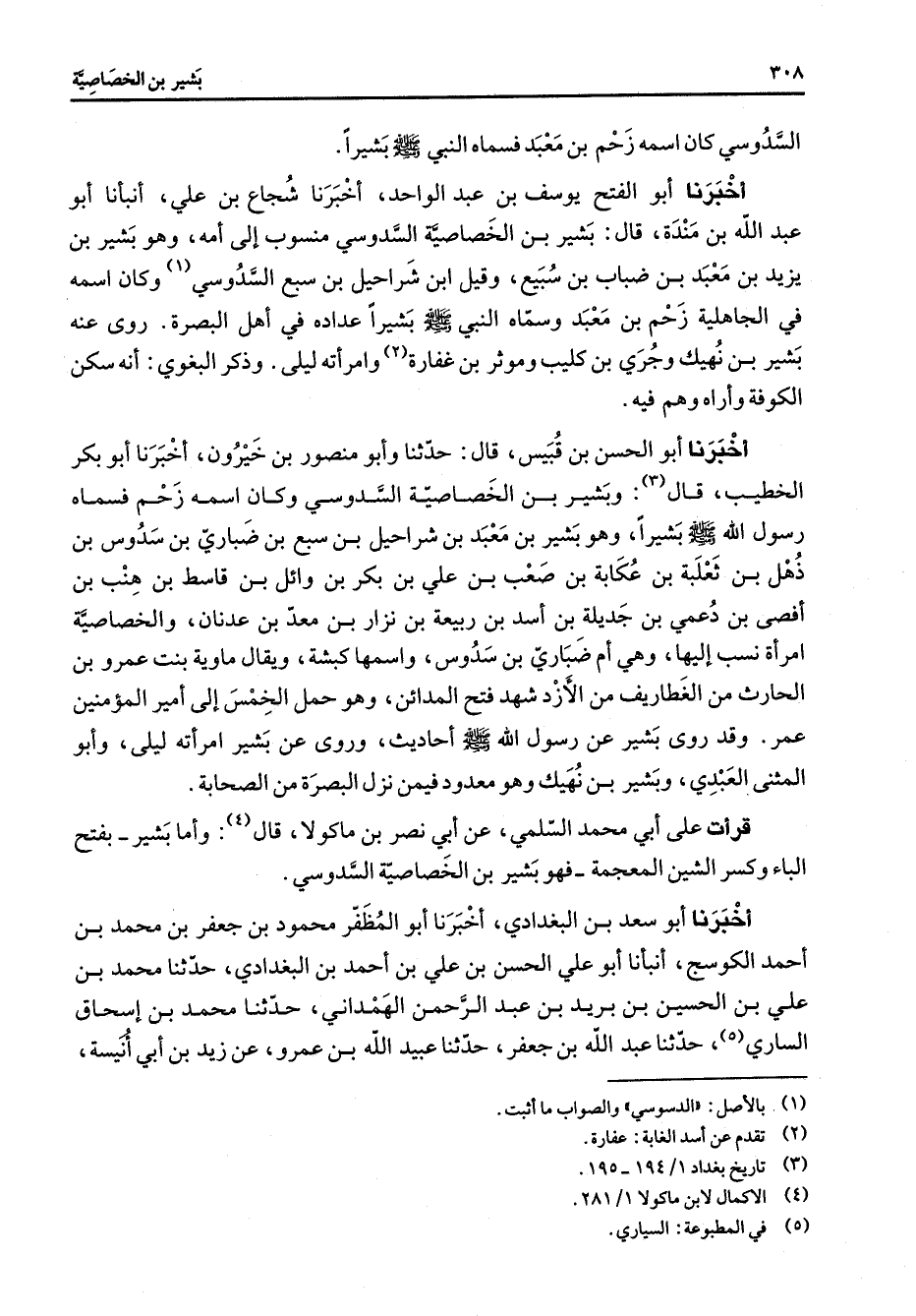 السدوسي كان اسمه زحم بن معبد فسماه النبي (صلى الله عليه وسلم) بشيرا أخبرنا أبو الفتح يوسف بن عبد الواحد أخبرنا شجاع بن علي أنبأنا أبو عبد الله بن مندة قال بشير بن الخصاصية السدوسي منسوب إلى أمه وهو بشير بن يزيد بن معبد بن ضباب بن سبيع وقيل ابن شراحيل بن سبع السدوسي (1) وكان اسمه في الجاهلية زحم بن معبد وسماه النبي (صلى الله عليه وسلم) بشيرا عداده في أهل البصرة روى عنه بشير بن نهيك وجري بن كليب وموثر بن غفارة (2) وامرأته ليلى وذكر البغوي انه سكن الكوفة وأراه وهم فيه أخبرنا أبو الحسن بن قبيس قال حدثنا وأبو منصور بن خيرون أخبرنا أبو بكر الخطيب قال (3) وبشير بن الخصاصية السدوسي وكان اسمه زحم فسماه رسول الله (صلى الله عليه وسلم) بشيرا وهو بشير بن معبد بن شراحيل بن سبع بن ضباري بن سدوس بن ذهل بن ثعلبة بن عكابة بن صعب بن علي بن بكر بن وائل بن قاسط بن هنب بن أفصى بن دعمي بن جديلة بن أسد بن ربيعة بن نزار بن معد بن عدنان والخصاصية امرأة نسب إليها وهي أم ضباري بن سدوس واسمها كبشة ويقال ماوية بنت عمرو بن الحارث من الغطاريف من الأزد شهد فتح المدائن وهو حمل الخمس إلى أمير المؤمنين عمر وقد روى بشير عن رسول الله (صلى الله عليه وسلم) أحاديث وروى عن بشير امرأته ليلى وأبو المثنى العبدي وبشير بن نهيك وهو معدود فيمن نزل البصرة من الصحابة قرأت على أبي محمد السلمي عن أبي نصر بن ماكو قال (4) وأما بشير بفتح الباء وكسر الشين المعجمة فهو بشير بن الخصاصية السدوسي أخبرنا أبو سعد بن البغدادي أخبرنا أبو المظفر محمود بن جعفر بن محمد بن أحمد الكوسج أنبأنا أبو علي الحسن بن علي بن أحمد بن البغدادي حدثنا محمد بن علي بن الحسين بن بريد بن عبد الرحمن الهمداني حدثنا محمد بن إسحاق الساري (5) حدثنا عبد الله بن جعفر حدثنا عبيد الله بن عمرو عن زيد بن أبي أنيسة