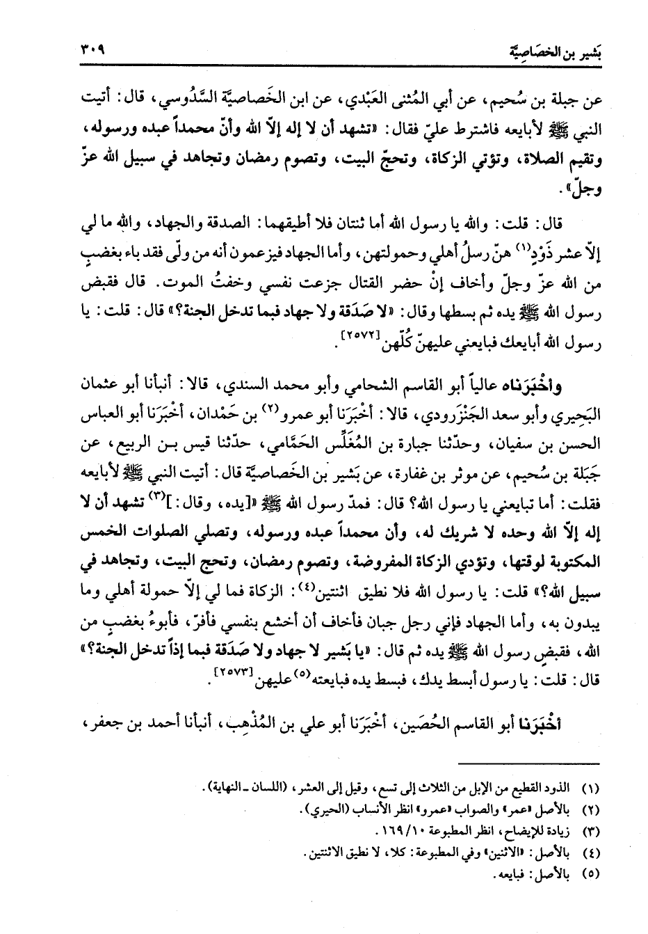[2572] قال قلت والله يا رسول الله أما ثنتان فلا أطيقهما الصدقة والجهاد والله ما لي إلا عشر ذود (1) هن رسل أهلي وحمولتهن وأما الجهاد فيزعمون أنه من ولى فقد باء بغضب من الله عز وجل وأخاف أن حضر القتال جزعت نفسي وخفت الموت قال فقبض رسول الله (صلى الله عليه وسلم) يده ثم بسطها وقال لا صدقة ولا جهاد فبمتدخل الجنة قال قلت يا رسول الله أبايعك فبايعني عليهن كلهن وأخبرناه عاليا أبو القاسم الشحامي وأبو محمد السندي قالا أنبأنا أبو عثمان البحيري وأبو سعد الجنزرودي قالا أخبرنا أبو عمرو (2) بن حمدان أخبرنا أبو العباس الحسن بن سفيان وحدثنا جبارة بن المغلس الحمامي حدثنا قيس بن الربيع عن جبلة بن سحيم عن موثر بن غفارة عن بشير بن الخاصية قال أتيت النبي (صلى الله عليه وسلم) لأبايعه فقلت أما تبايعني يا رسول الله قال فمد رسول الله (صلى الله عليه وسلم) يده وقال (3) تشهد أن لا إله إلا الله وحده لا شريك له وأن محمدا عبده ورسوله وتصلي الصلوات الخمس المكتوبة لوقتها وتؤدي الزكاة المفروضة وتصوم رمضان وتحج البيت وتجاهد في سبيل الله قلت يا رسول الله فلا نطيق اثنتين (4) الزكاة فما لي إلا حمولة أهلي وما يبدون به وأما الجهاد فإني رجل جبان فأخاف أن أخشع بنفسي فأفر فأبوء بغضب من الله فقبض رسول الله (صلى الله عليه وسلم) يده ثم قال يا بشير لا جهاد ولا صدقة فبما إذا تدخل الجنة قال قلت يا رسول الله أبسط يدك فبسط يده فبايعته (5) عليهن