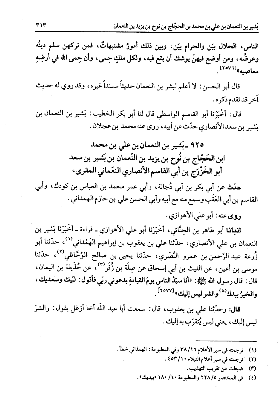 925 - بشير بن النعمان بن علي بن محمد ابن الحجاج بن نوح بن يزيد بن النعمان بن بشير بن سعد أبو الخزرج بن أبي القاسم الأنصاري النعماني المقرئ حدث عن أبي بكر بن أبي دجانة وأبي عمر محمد بن العباس بن كودك وأبي القاسم بن أبي العقب وسمع منه مع أبيه وأبي الحسن علي بن حازم الهمداني روى عنه أبو علي الأهوازي أنبأنا أبو طاهر بن الحنائي أخبرنا أبو علي الأهوازي قراءة أخبرنا بشير بن النعمان بن علي الأنصاري حدثنا علي بن يعقوب بن إبراهيم الهمداني (1) حدثنا أبو زرعة عبد الرحمن بن عمرو النصري حدثنا يحيى بن صالح الوحاظي (2) حدثنا موسى بن أعين عن الليث بن أبي إسحاق عن صلة بن زفر (3) عن حذيفة بن اليمان قال قال رسول الله (صلى الله عليه وسلم) أنا سيد الناس يوم القيامة يدعوني ربي فأقول لبيك وسعديك والخير بيدك (4) والشر ليس إليك