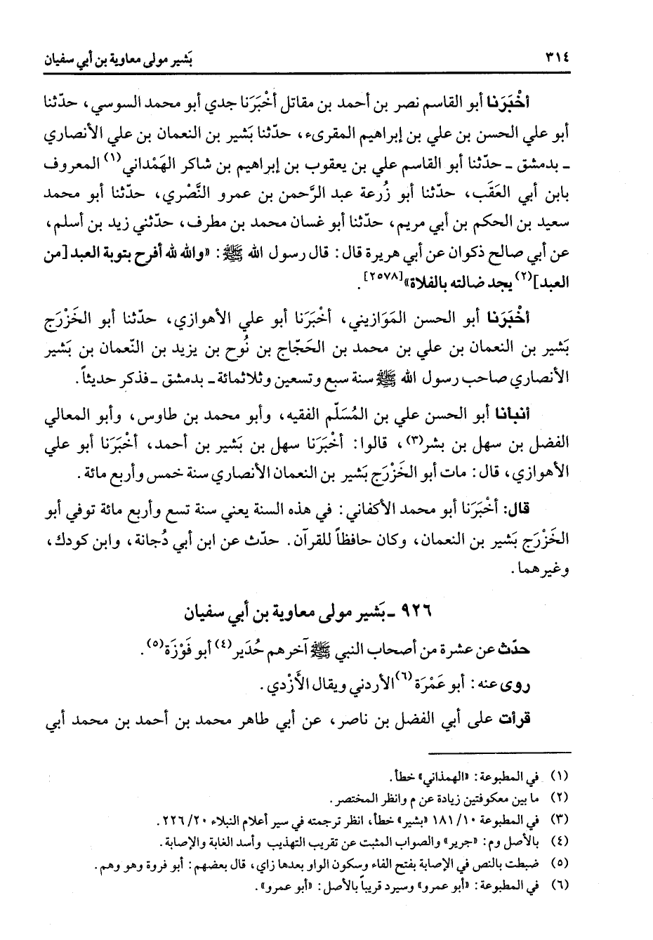 926 - بشير مولى معاوية بن أبي سفيان حدث عن عشرة من أصحاب النبي (صلى الله عليه وسلم) آخرهم حدير (4) أبو فوزة (5) روى عنه أبو عمرة (6) الأردني ويقال الأزدي قرأت على أبي الفضل بن ناصر عن أبي طاهر محمد بن أحمد بن محمد أبي