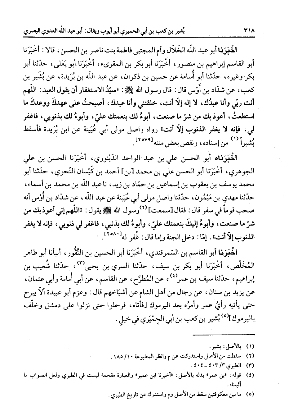 أخبرنا أبو عبد الله الخلال وأم المجتبى فاطمة بنت ناصر بن الحسن قالا أخبرنا أبو القاسم إبراهيم بن منصور أخبرنا أبو بكر بن المقرئ أخبرنا أبو يعلى حدثنا أبو بكر وغيره حدثنا أبو أسامة عن حسين بن ذكوان عن عبد الله بن بريدة عن بشير بن كعب عن شداد بن أوس قال قال رسول الله (صلى الله عليه وسلم) سيد الاستغفار أن يقول العبد اللهم أنت ربي وأنا عبدك لا إله إلا أنت خلقتني وأنا عبدك أصبحت على عهدك ووعدك ما استطعت أعوذ بك من شر ما صنعت أبوء لك بنعمتك علي وأبوء لك بذنوبي فاغفر لي فإنه يغفر الذنوب إلا أنت رواه واصل مولى أبي عيينة عن ابن بريدة فأسقط بشيرا (1) من إسناده ونقص بعض متنه