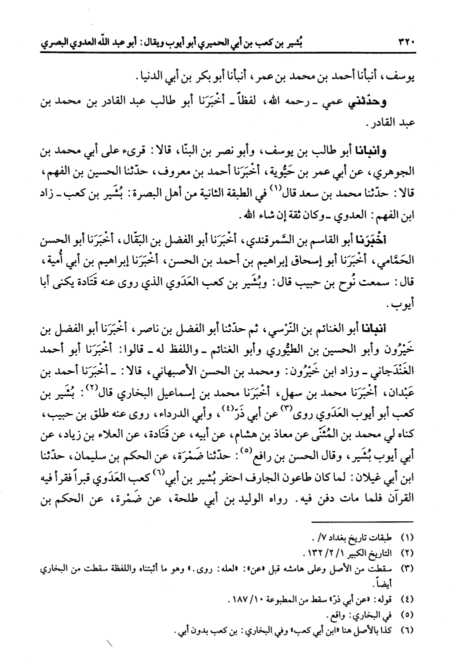 يوسف أنبأنا أحمد بن محمد بن عمر أنبأنا أبو بكر بن أبي الدنيا وحدثني عمي رحمه الله لفظا أخبرنا أبو طالب عبد القادر بن محمد بن عبد القادر وأنبأنا أبو طالب بن يوسف وأبو نصر بن البنا قالا قرئ على أبي محمد بن الجوهري عن ابي عمر بن حيوية أخبرنا أحمد بن معروف حدثنا الحسين بن الفهم قالا حدثنا محمد بن سعد قال (1) في الطبقة الثانية من أهل البصرة بشير بن كعب زاد ابن الفهم العدوي وكان ثقة إن شاء الله أخبرنا أبو القاسم بن السمرقندي أخبرنا أبو الفضل بن البقال أخبرنا أبو الحسن الحمامي أخبرنا أبو إسحاق إبراهيم بن أحمد بن الحسن أخبرنا إبراهيم بن أبي أمية قال سمعت نوح بن حبيب قال وبشير بن كعب العدوي الذي روى عنه قتادة يكنى أبا أيوب أنبأنا أبو الغنائم بن النرسي ثم حدثنا أبو الفضل بن ناصر أخبرنا أبو الفضل بن خيرون وأبو الحسين بن الطيوري وأبو الغنائم واللفظ له قالوا أخبرنا أبو أحمد الغندجاني وزاد ابن خيرون ومحمد بن الحسن الأصبهاني قالا أخبرنا أحمد بن عبدان أخبرنا محمد بن سهل أخبرنا محمد بن إسماعيل البخاري قال (2) بشير بن كعب أبو أيوب العدوي روى (3) عن أبي ذر (4) وأبي الدرداء روى عنه طلق بن حبيب كناه لي محمد بن المثنى عن معاذ بن هشام عن أبيه عن قتادة عن العلاء بن زياد عن أبي أيوب بشير وقال الحسن بن رافع (5) : حدثنا ضمرة عن الحكم بن سليمان حدثنا ابن أبي غيلان لما كان طاعون الجارف احتفر بشير بن أبي (6) كعب العدوي قبرا فقرأ فيه القرآن فلما مات دفن فيه رواه الوليد بن أبي طلحة عن ضمرة عن الحكم بن