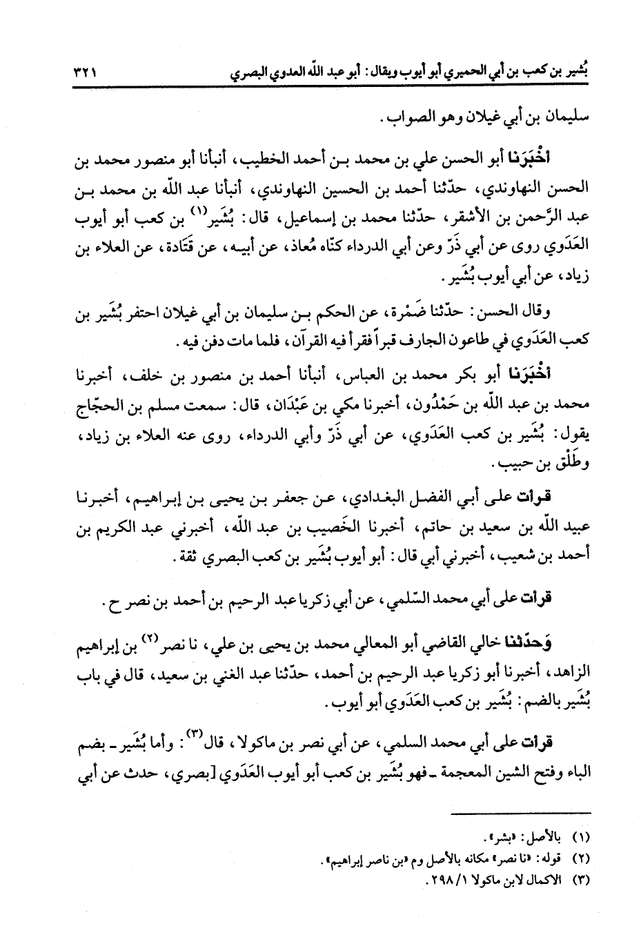 سليمان بن أبي غيلان وهو الصواب أخبرنا أبو الحسن علي بن محمد بن أحمد الخطيب أنبأنا أبو منصور محمد بن الحسن النهاوندي حدثنا أحمد بن الحسين النهاوندي أنبأنا عبد الله بن محمد بن عبد الرحمن بن الأشقر حدثنا محمد بن إسماعيل قال بشير (1) بن كعب أبو أيوب العدوي روى عن أبي ذر وعن أبي الدرداء كناه معاذ عن أبيه عن قتادة عن العلاء بن زياد عن أبي أيوب بشير وقال الحسن حدثنا ضمرة عن الحكم بن سليمان بن أبي غيلان احتفر بشير بن كعب العدوي في طاعون الجارف قبرا فقرأ فيه القرآن فلما مات دفن فيه أخبرنا أبو بكر محمد بن العباس أنبأنا أحمد بن منصور بن خلف أخبرنا محمد بن عبد الله بن حمدون أخبرنا مكي بن عبدان قال سمعت مسلم بن الحجاج يقول بشير بن كعب العدوي عن أبي ذر وأبي الدرداء روى عنه العلاء بن زياد وطلق بن حبيب قرأت على أبي الفضل البغدادي عن جعفر بن يحيى بن إبراهيم أخبرنا عبيد الله بن سعيد بن حاتم أخبرنا الخصيب بن عبد الله أخبرني عبد الكريم بن أحمد بن شعيب أخبرني أبي قال أبو أيوب بشير بن كعب البصري ثقة قرأت على أبي محمد السلمي عن أبي زكريا عبد الرحيم بن أحمد بن نصر ح وحدثنا خالي القاضي أبو المعالي محمد بن يحيى بن علي نا نصر (2) بن إبراهيم الزاهد أخبرنا أبو زكريا عبد الرحيم بن أحمد حدثنا عبد الغني بن سعيد قال في باب بشير بالضم بشير بن كعب العدوي أبو أيوب قرأت على أبي محمد السلمي عن أبي نصر بن ماكولا قال (3) وأما بشير بضم الباء وفتح الشين المعجمة فهو بشير بن كعب أبو أيوب العدوي بصري حدث عن أبي