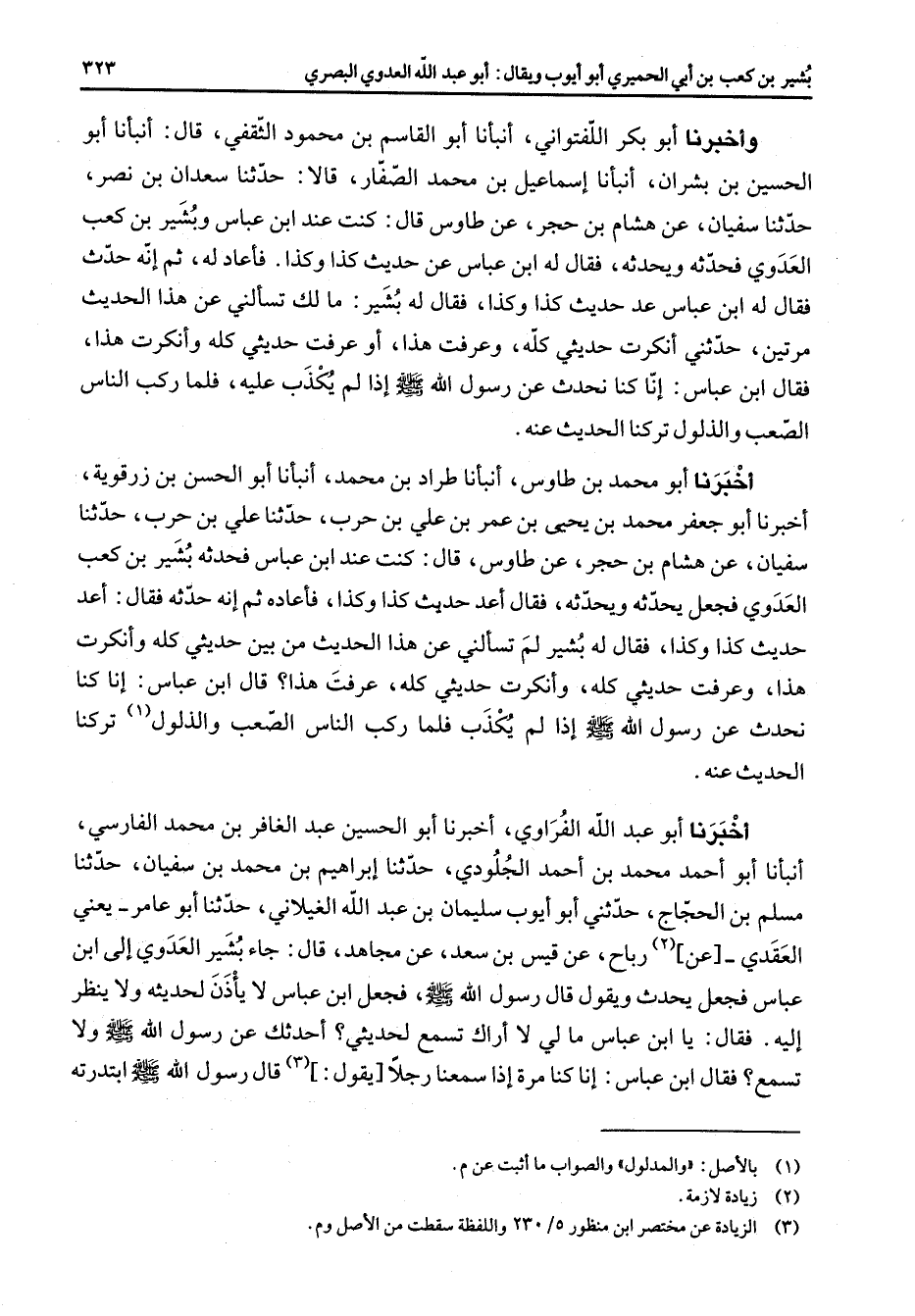 وأخبرنا أبو بكر اللفتواني أنبأنا أبو القاسم بن محمود الثقفي قال أنبأنا أبو الحسين بن بشران أنبأنا إسماعيل بن محمد الصفار قال حدثنا سعدان بن نصر حدثنا سفيان عن هشام بن حجر عن طاوس قال كنت عند ابن عباس وبشير بن كعب العدوي فحدثه ويحدثه فقال له ابن عباس عن حديث كذا وكذا فأعا له ثم إنه حدث فقال له ابن عباس عد حديث كذا وكذا فقال له بشير ما لك تسألني عن هذا الحديث مرتين حدثني أنكرت حديثي كله وعرفت هذا أو عرفت حديثي كله وأنكرت هذا فقال ابن عباس إنا كنا نحدث عن رسول الله (صلى الله عليه وسلم) إذا لم يكذب عليه فلما ركب الناس الصعب والذلول تركنا الحديث عنه أخبرنا أبو محمد بن طاوس أنبأنا طراد بن محمد أنبأنا أبو الحسن بن زرقوية أخبرنا أبو جعفر محمد بن يحيى بن عمر بن علي بن حرب حدثنا علي بن حرب حدثنا سفيان عن هشام بن حجر عن طاوس قال كنت عند ابن عباس فحدثه بشير بن كعب العدوي فجعل يحدث ويحدثه فقال أعد حديث كذا وكذا فأعاده ثم إنه حدثه فقال أعد حديث كذا وكذا فقال له بشير لم تسألني عن هذا الحديث من بين حديثي كله وأنكرت هذا وعرفت حديثي كله وأنكرت حديثي كله عرفت هذا قال ابن عباس إنا كنا نحدث عن رسول الله (صلى الله عليه وسلم) إذا لم يكذب فلما ركب الناس الصعب والذلول (1) تركنا الحديث عنه أخبرنا أبو عبد الله الفراوي أخبرنا أبو الحسين عبد الغافر بن محمد الفارسي أنبأنا أبو أحمد محمد بن أحمد الجلودي حدثنا إبراهيم بن محمد بن سفيان حدثنا مسلم بن الحجاج حدثني أبو أيوب سليمان بن عبد الله الغيلاني حدثنا أبو عامر يعني العقدي عن (2) رباح عن قيس بن سعد عن مجاهد قال جاء بشير العدوي إلى ابن عباس فجعل يحدث ويقول قال رسول الله (صلى الله عليه وسلم) فجعل ابن عباس لا يأذن لحديثه ولا ينظر إليه فقال يا ابن عباس ما لي لا أراك تسمع لحديثي أحدثك عن رسول الله (صلى الله عليه وسلم) ولا تسمع فقال ابن عباس إنا كنا مرة إذا سمعنا رجلا يقول (3) قال رسول الله (صلى الله عليه وسلم) ابتدرته