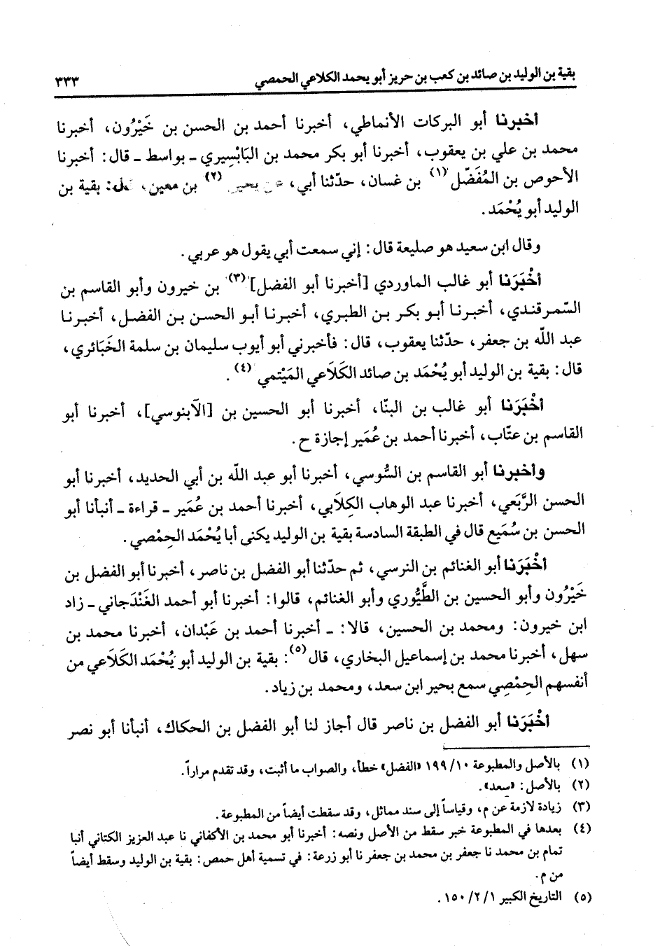 أخبرنا أبو البركات الأنماطي أخبرنا أحمد بن الحسن بن خيرون أخبرنا محمد بن علي بن يعقوب أخبرنا أبو بكر محمد بن البابسيري بواسط قال أخبرنا الأحوص بن المفضل (1) بن غسان حدثنا أبي عن يحيى (2) بن معين قال بقية بن الوليد أبو يحمد وقال ابن سعيد هو صليعة قال إني سمعت أبي يقول هو عربي أخبرنا أبو غالب الماوردي أخبرنا أبو الفضل (3) بن خيرون وأبو القاسم بن السمرقندي أخبرنا أبو بكر بن الطبري أخبرنا أبو الحسن بن الفضل أخبرنا عبد الله بن جعفر حدثنا يعقوب قال فأخبرني أبو أيوب سليمان بن سلمة الخبائري قال بقية بن الوليد أبو يحمد بن صائد الكلاعي الميتمي (4) أخبرنا أبو غالب بن البنا أخبرنا أبو غالب ين بن الآبنوسي أخبرنا أبو القاسم بن عتاب أخبرنا أحمد بن عمير إجازة ح وأخبرنا أبو القاسم بن السوسي أخبرنا أبو عبد الله بن أبي الحديد أخبرنا أبو الحسن الربعي أخبرنا عبد الوهاب الكلابي أخبرنا أحمد بن عمير قراءة أنبأنا أبو الحسن بن سميع قال في الطبقة السادسة بقية بن الوليد يكنى أبا يحمد الحمصي أخبرنا أبو الغنائم بن النرسي ثم حدثنا أبو الفضل بن ناصر أخبرنا أبو الفضل بن خيرون وأبو الحسين بن الطيوري وأبو الغنائم قالوا أخبرنا أبو أحمد الغندجاني زاد ابن خيرون ومحمد بن الحسين قالا أخبرنا أحمد بن عبدان أخبرنا محمد بن سهل أخبرنا محمد بن إسماعيل البخاري قال (5) بقية بن الوليد أبو يحمد الكلاعي من أنفسهم الحمصي سمع بحير ابن سعد ومحمد بن زياد أخبرنا أبو الفضل بن ناصر قال أجاز لنا أبو الفضل بن الحكاك أنبأنا أبو نصر