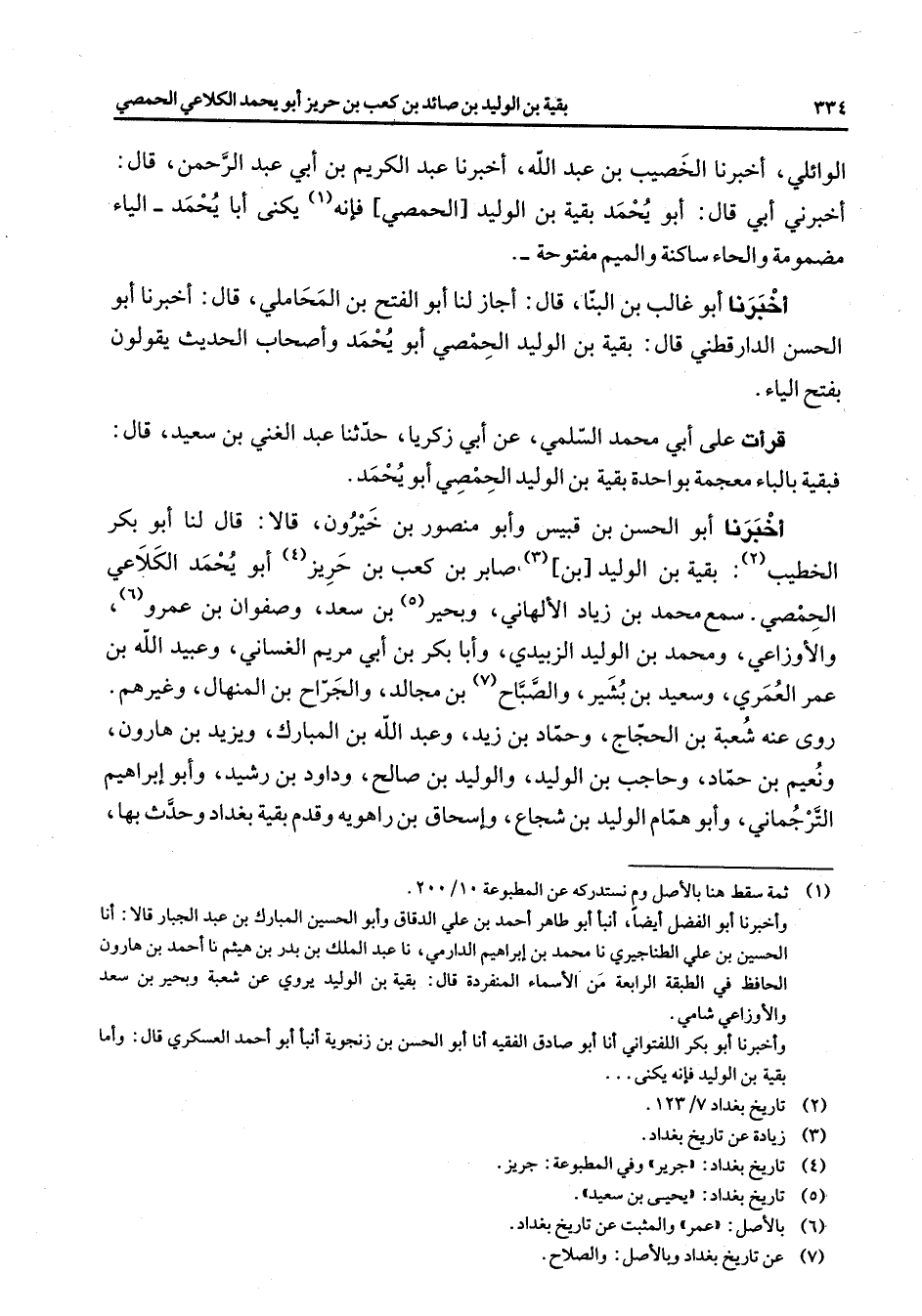 الوائلي أخبرنا الخصيب بن عبد الله أخبرنا عبد الكريم بن أبي عبد الرحمن قال أخبرني أبي قال أبو يحمد بقية بن الوليد الحمصي فإنه (1) يكنى أبا يحمد الياء مضمومة والحاء ساكنة والميم مفتوحة أخبرنا أبو غالب بن البنا قال أجاز لنا أبو الفتح بن المحاملي قال أخبرنا أبو الحسن الدارقطني قال بقية بن الوليد الحمصي أبو يحمد وأصحاب الحديث يقولون بفتح الياء قرأت على أبي محمد السلمي عن أبي زكريا حدثنا عبد الغني بن سعيد قال فبقية بالباء معجمة بواحدة بقية بن الوليد الحمصي أبو يحمد أخبرنا أبو الحسن بن قبيس وأبو منصور بن خيرون قالا قال لنا أبو بكر الخطيب (2) بقية بن الوليد بن (3) صابر بن كعب بن حريز (4) أبو يحمد الكلاعي الحمصي سمع محمد بن زياد الألهاني وبحير (5) بن سعد وصفوان بن عمرو (6) والأوزاعي ومحمد بن الوليد الزبيدي وأبا بكر بن أبي مريم الغساني وعبيد الله بن عمر العمري وسعيد بن بشير والصباح (7) بن مجالد والجراح بن المنهال وغيرهم روى عنه شعبة بن الحجاج وحماد بن زيد وعبد الله بن المبارك ويزيد بن هارون ونعيم بن حماد وحاجب بن الوليد والوليد بن صالح وداود بن رشيد وأبو إبراهيم الترجماني وأبو همام الوليد بن شجاع وإسحاق بن راهويه وقدم بقية بغداد وحدث بها