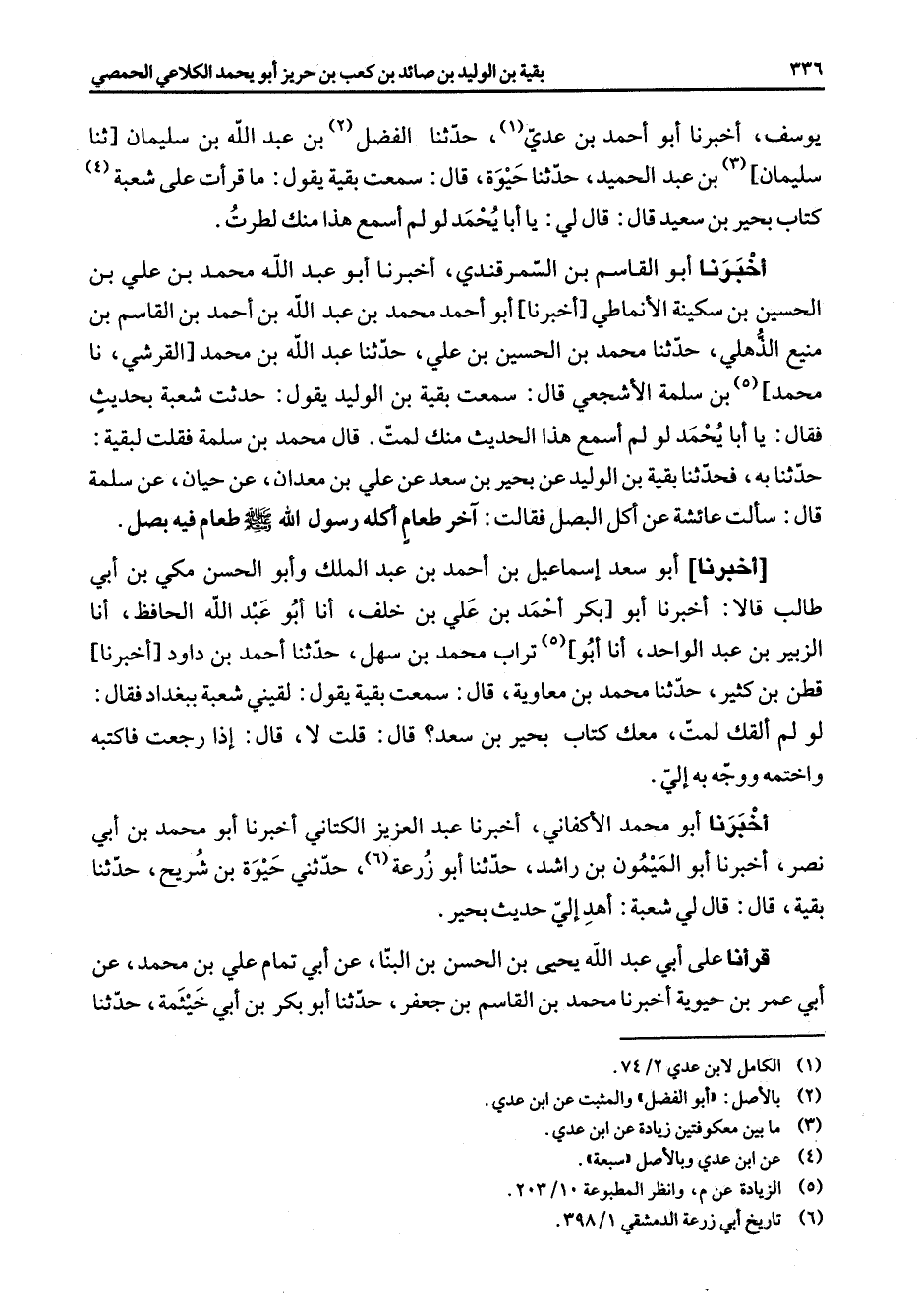يوسف أخبرنا أبو أحمد بن عدي (1) حدثنا الفضل (2) بن عبد الله بن سليمان ثنا سليمان (3) بن عبد الحميد حدثنا حيوة قال سمعت بقية يقول ما قرأت على شعبة (4) كتاب بحير بن سعيد قال قال لي يا أبا يحمد لو لم أسمع هذا منك لطرت أخبرنا أبو القاسم بن السمرقندي أخبرنا أبو عبد الله محمد بن علي بن الحسين بن سكينة الأنماطي أخبرنا أبو أحمد محمد بن عبد الله بن أحمد بن القاسم بن منيع الذهلي حدثنا محمد بن الحسين بن علي حدثنا عبد الله بن محمد القرشي نا محمد (5) بن سلمة الأشجعي قال سمعت بقية بن الوليد يقول حدثت شعبة بحديث فقال يا أبا يحمد لو لم أسمع هذا الحديث منك لمت قال محمد بن سلمة فقلت لبقية حدثنا به فحدثنا بقية بن الوليد عن بحير بن سعد عن علي بن معدان عن حيان عن سلمة قال سألت عائشة عن أكل البصل فقال آخر طعام أكله رسول الله (صلى الله عليه وسلم) طعام فيه بصل أخبرنا أبو سعد إسماعيل بن أحمد بن عبد الملك وأبو الحسن مكي بن أبي طالب قالا أخبرنا أبو بكر أحمد بن علي بن خلف أنا أبو عبد الله الحافظ أنا الزبير بن عبد الواحد أنا أبو (5) تراب محمد بن سهل حدثنا أحمد بن داود أخبرنا قطن بن كثير حدثنا محمد بن معاوية قال سمعت بقية يقول لقيني شعبة ببغداد فقال لو لم ألقك لمت معك كتاب بحير بن سعد قال قلت لا قال إذا رجعت فاكتبه واختمه ووجه به إلي أخبرنا أبو محمد الأكفاني أخبرنا عبد العزيز الكتاني أخبرنا أبو محمد بن أبي نصر أخبرنا أبو الميمون بن راشد حدثنا أبو زرعة (6) حدثني حيوة بن شريح حدثنا بقية قال لي شعبة أهد إلي حديث بحير قرأنا على أبي عبد الله يحيى بن الحسن بن البنا عن أبي تمام علي بن محمد عن أبي عمر بن حيوية أخبرنا محمد بن القاسم بن جعفر حدثنا أبو بكر بن أبي خيثمة حدثنا